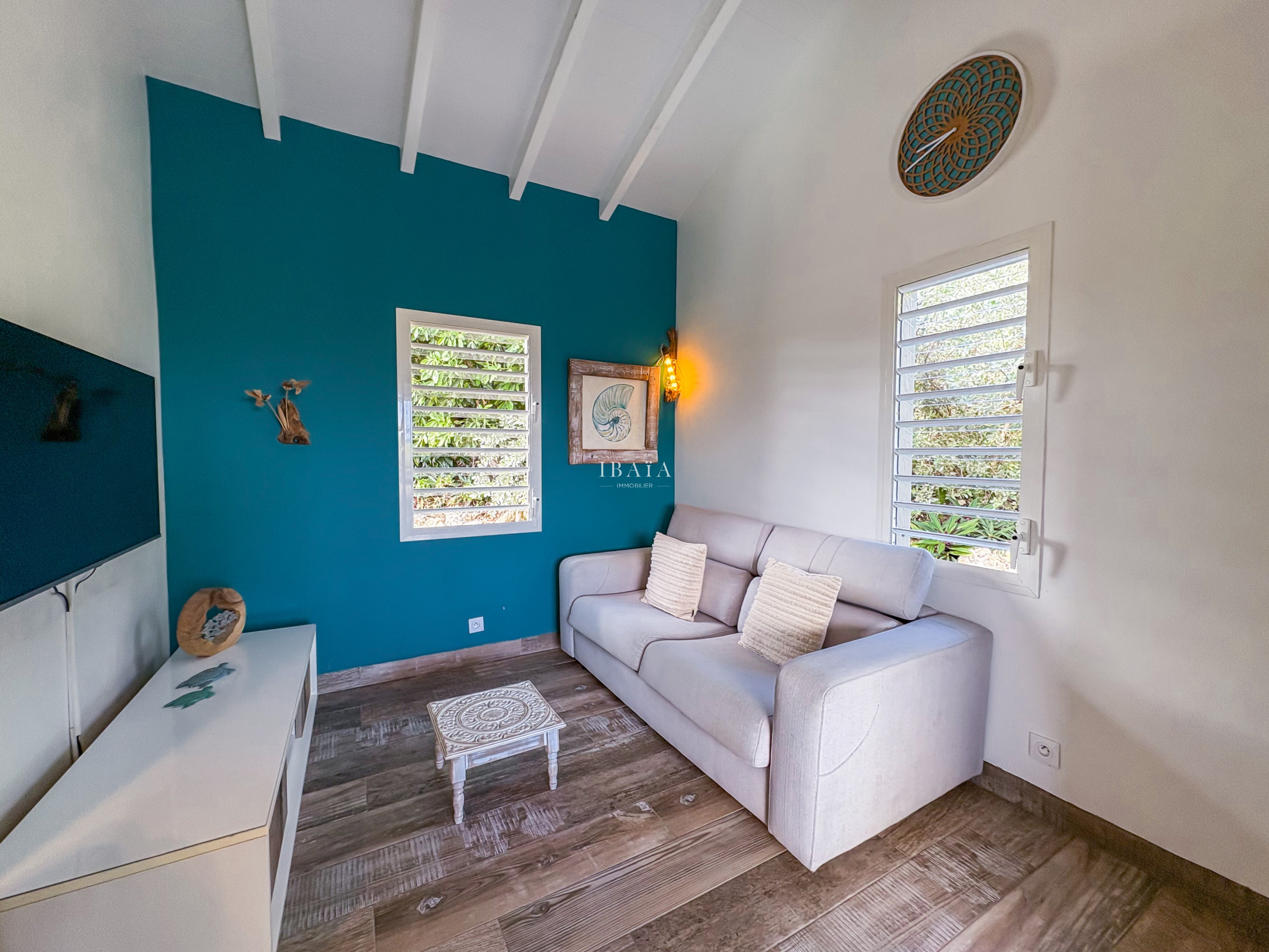 The highlight lies in the breathtaking view of the ocean and the island of La Désirade, visible from the terrace and deck. Every moment spent here invites contemplation, serenity and wonder, whether at sunrise or during a peaceful tropical evening.