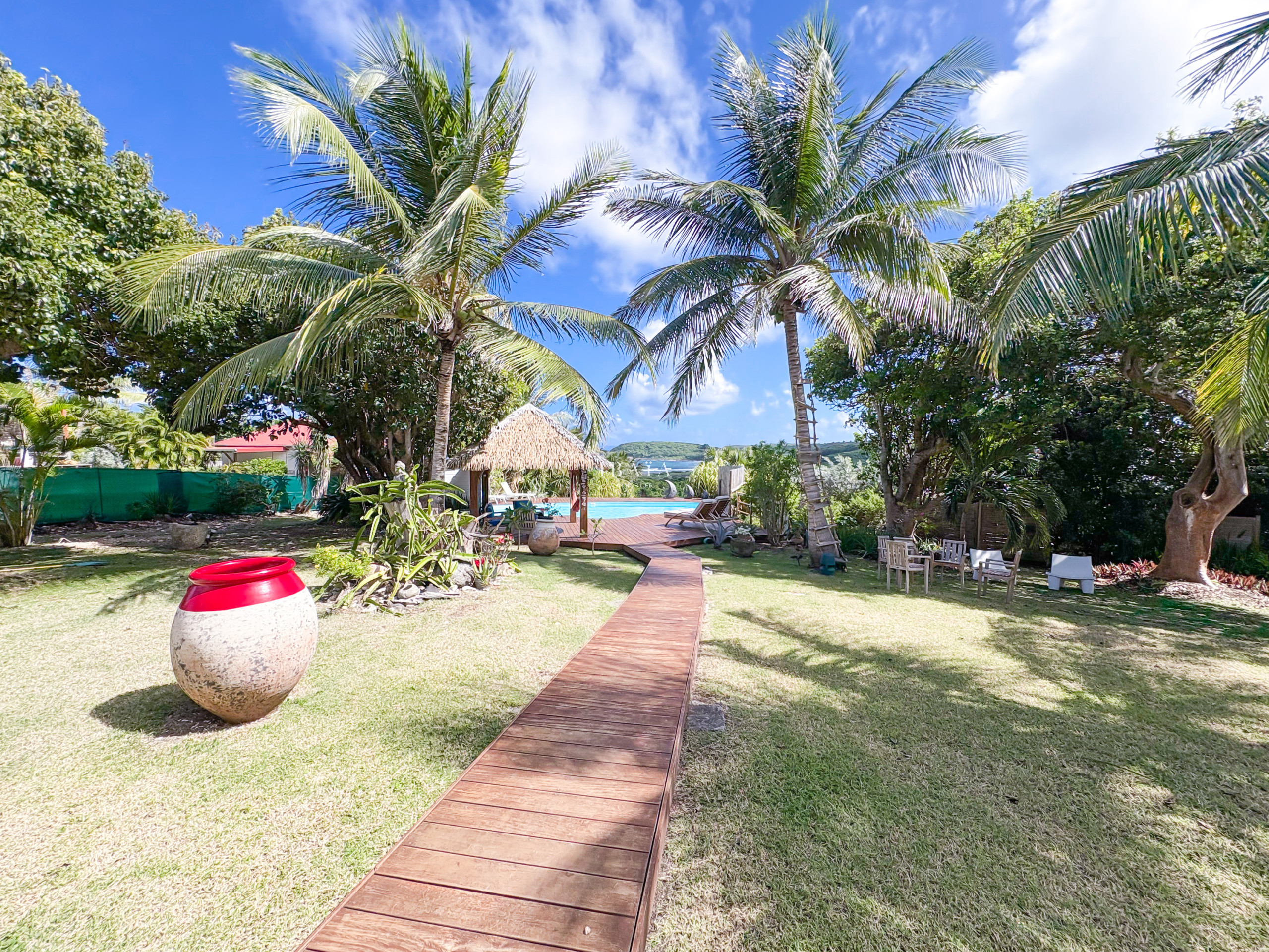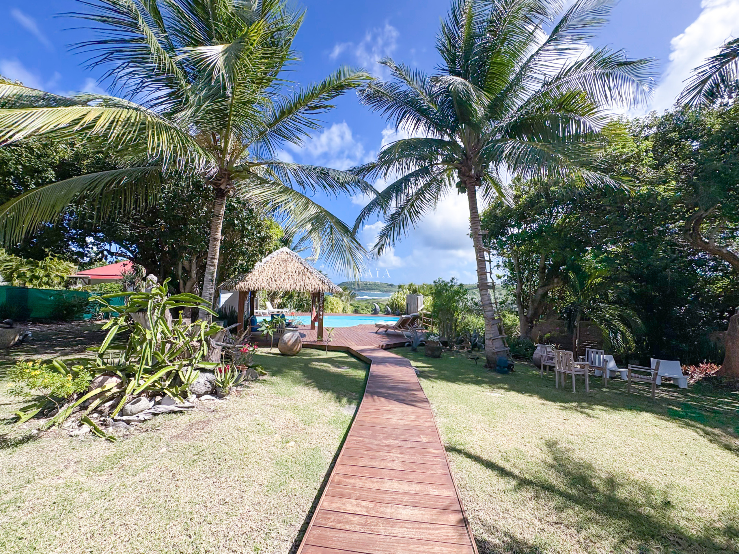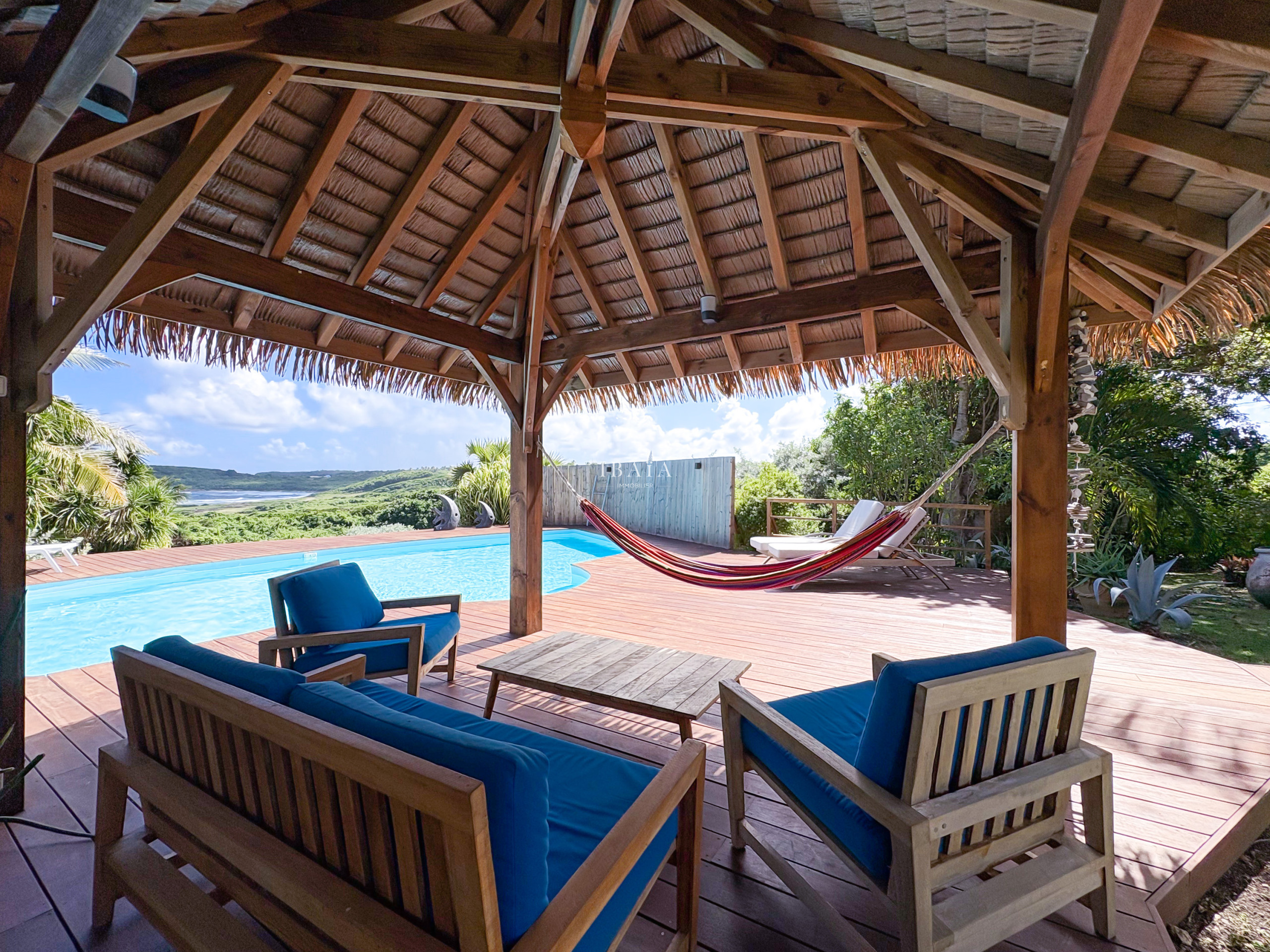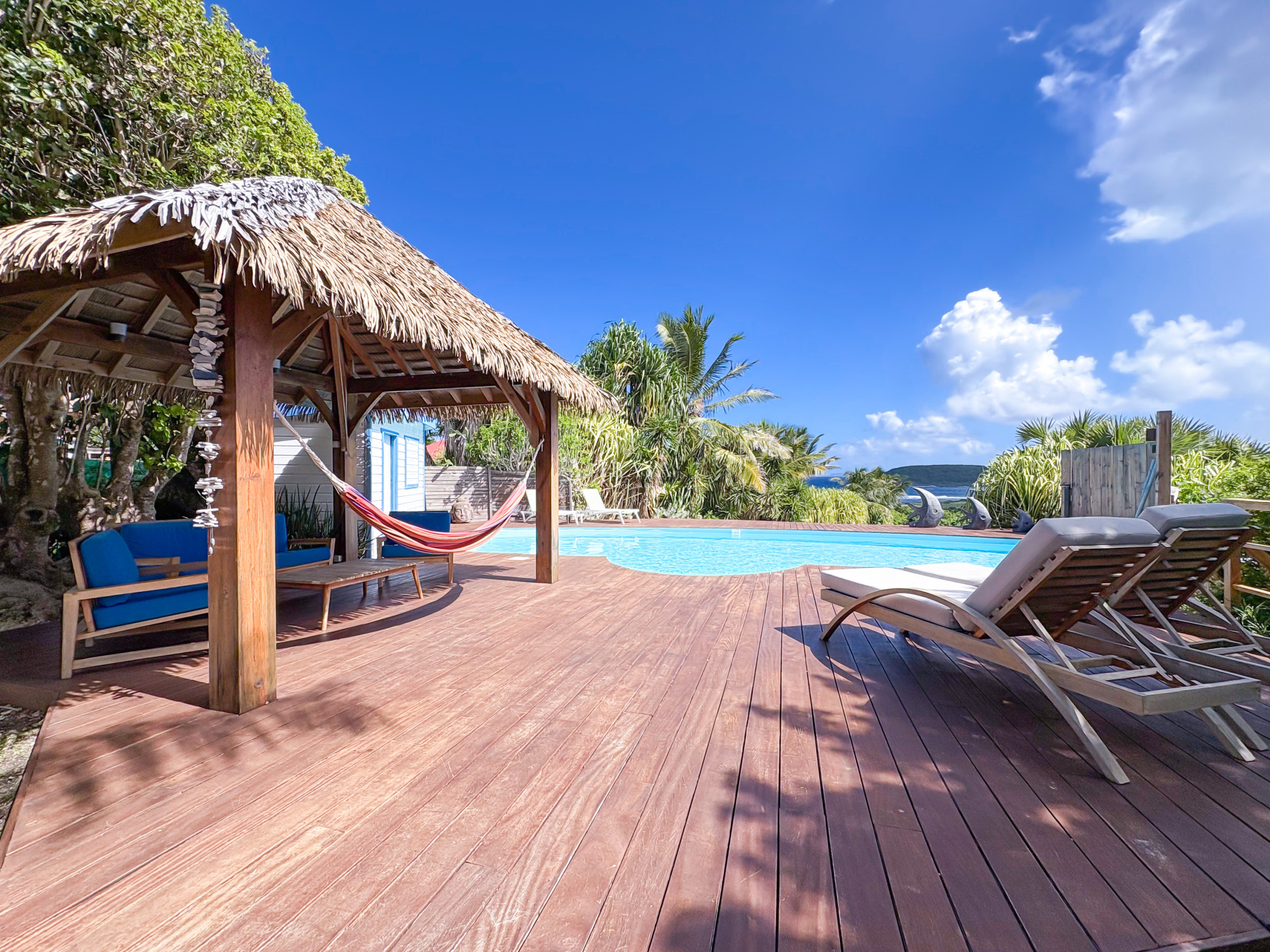 · An exotic wood deck, extended by a 10m x 5m salt water pool, a true oasis of coolness with sea view.