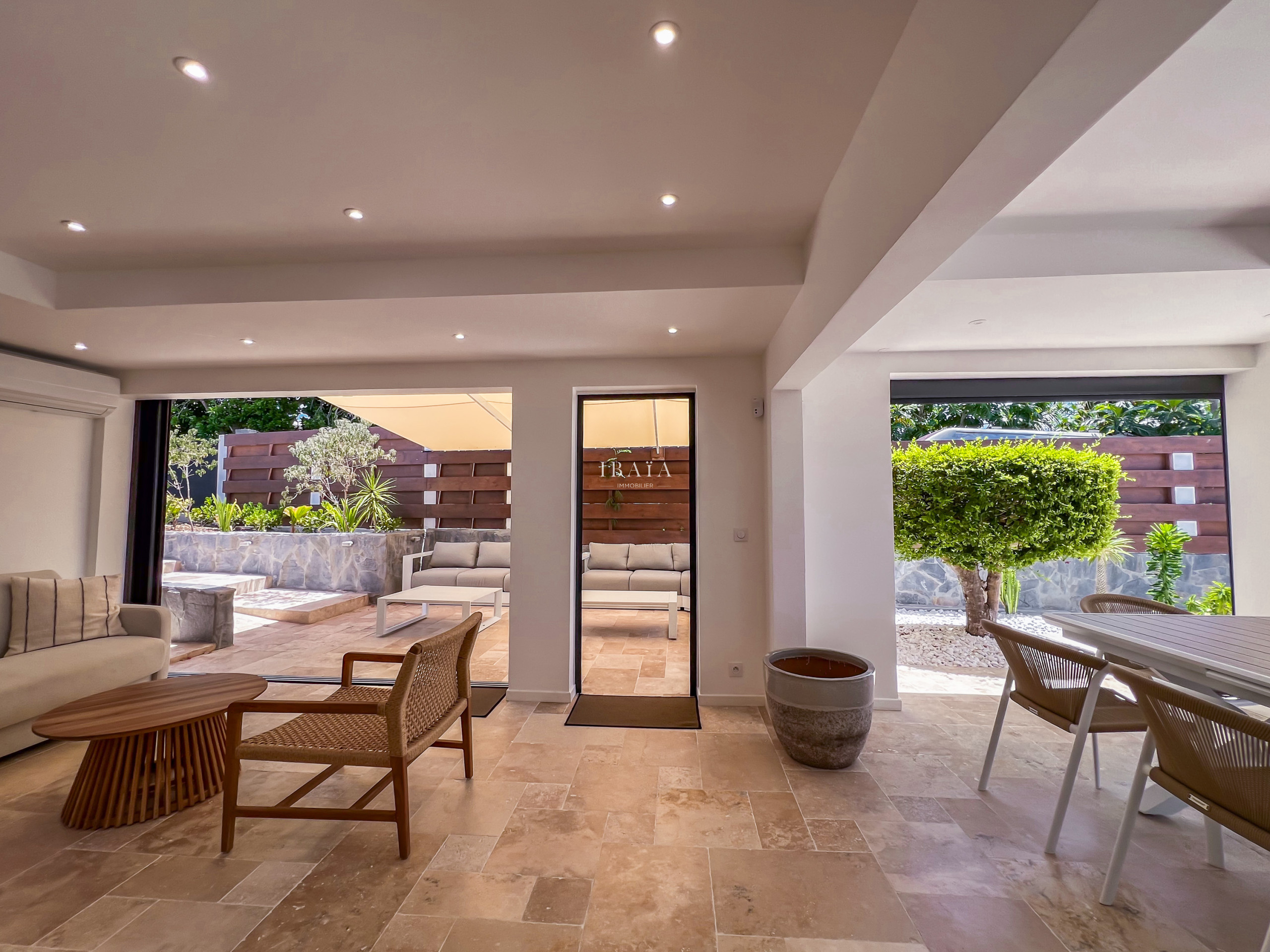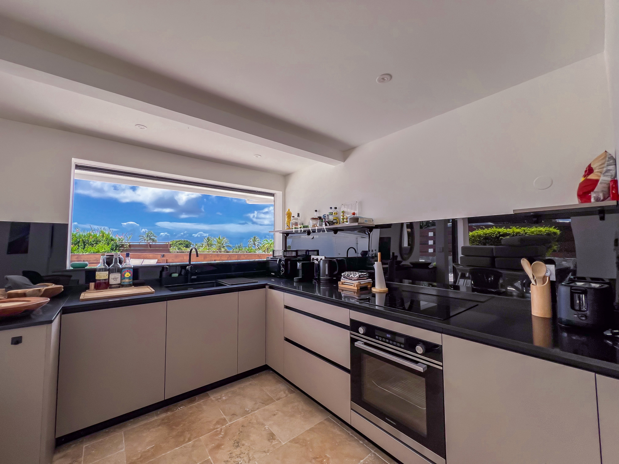 Each space of this villa is bathed in light, thanks to its large openings to the outside. Upon entering, you will be greeted by a large living room, made up of a living room and a fully equipped American kitchen.