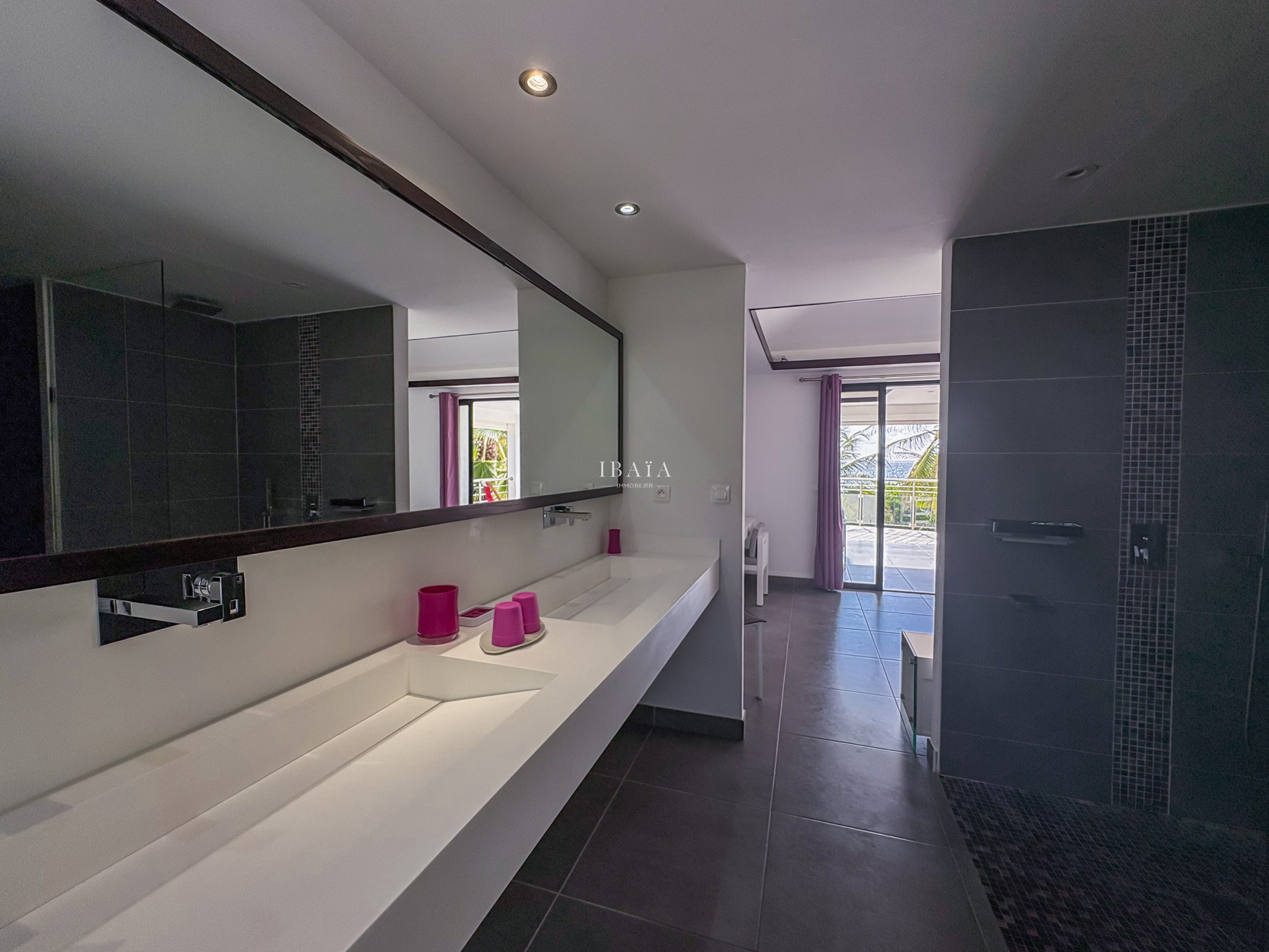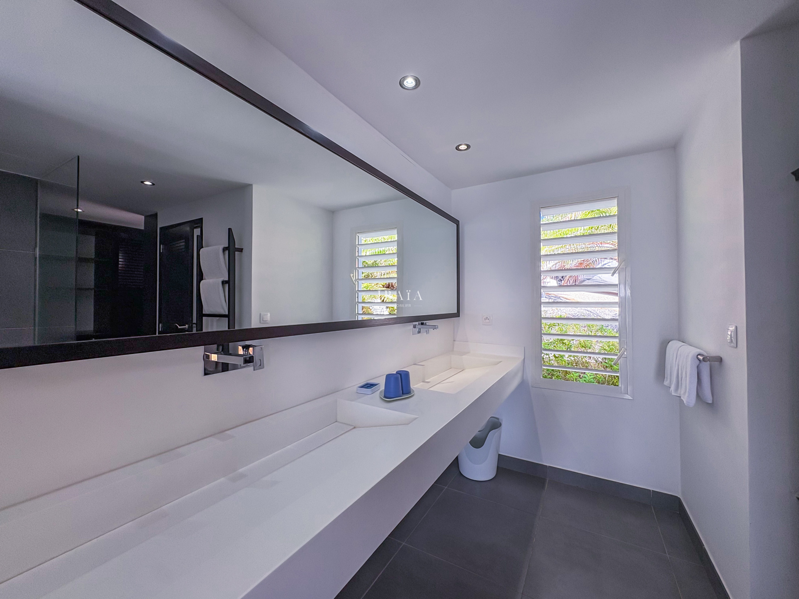 Its contemporary architecture makes it completely open to the outside. Indeed, a vast deck terrace, decorated with a private swimming pool and its gardens, invites you to take full advantage of the sunny climate of Guadeloupe. Thus offering an ideal atmosphere to relax and recharge your batteries.
