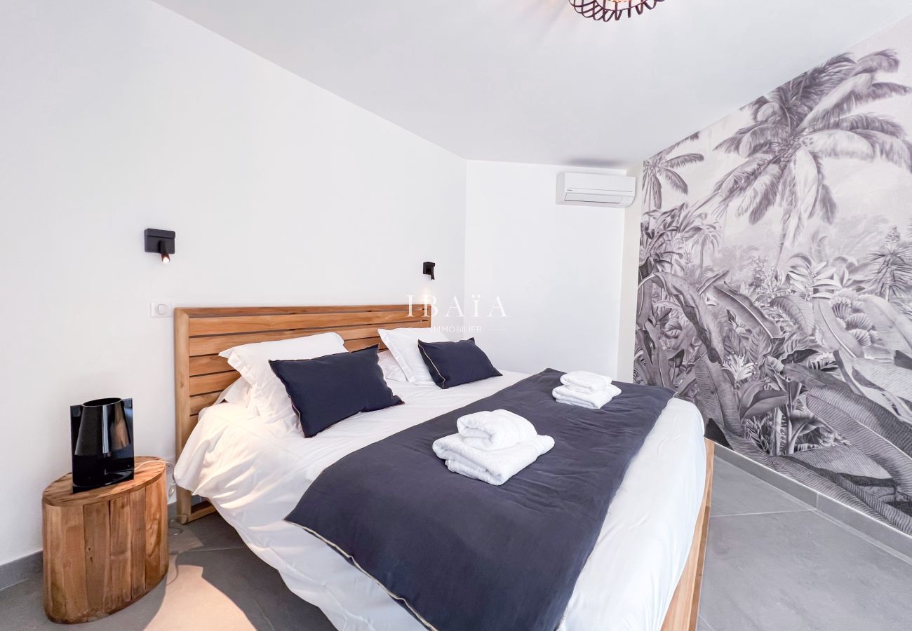 On the interior side, the villa benefits from high ceilings in the living rooms. The spaces are bathed in light thanks to large bay windows, facing the swimming pool and the garden.