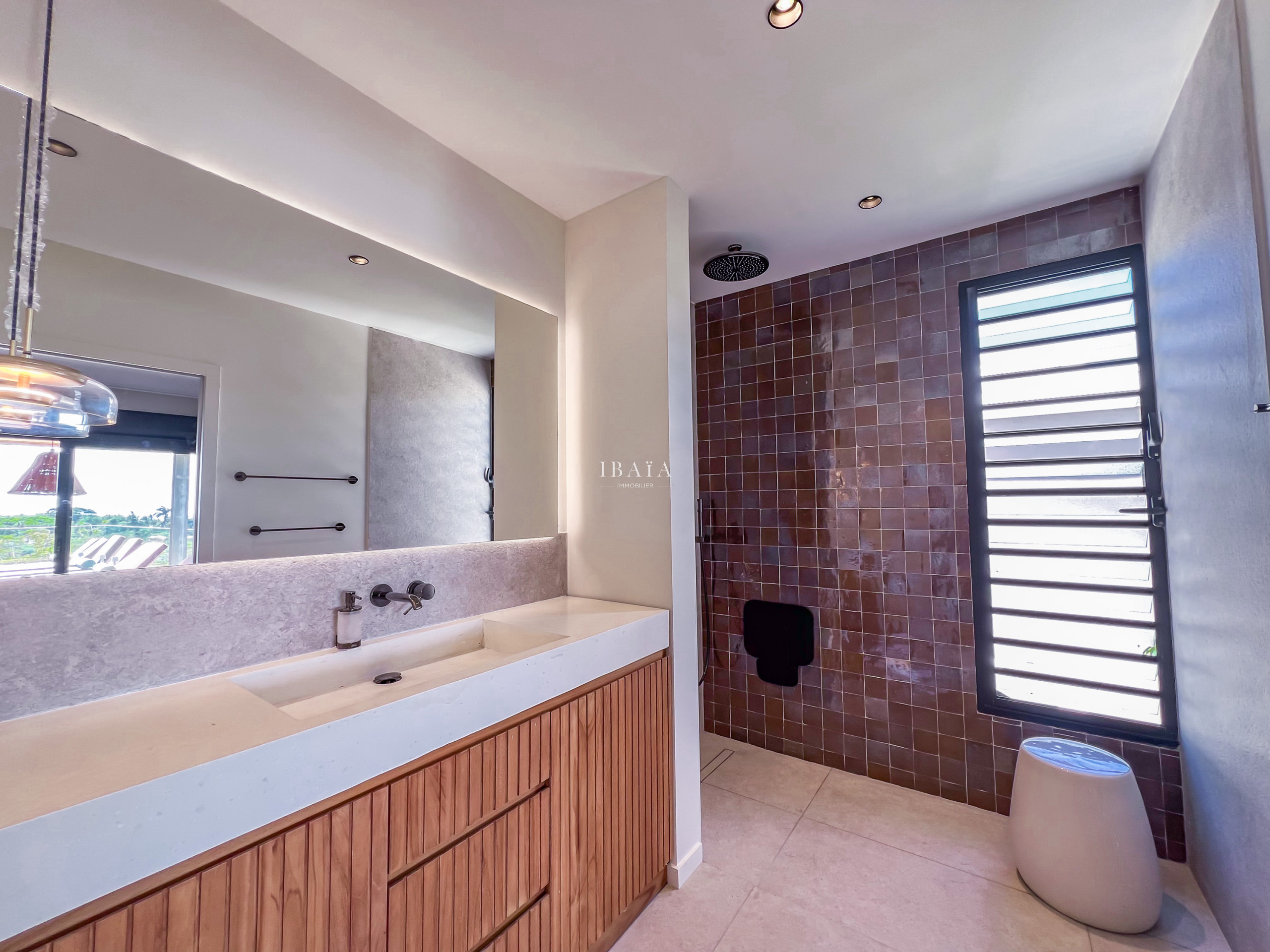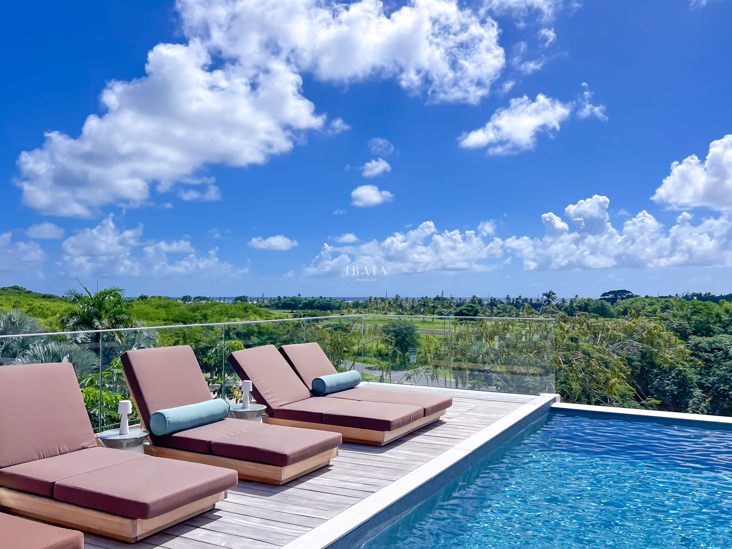 Its contemporary architecture makes it completely open to the outside. Indeed, a vast deck terrace, decorated with a private swimming pool and its gardens, invites you to take full advantage of the sunny climate of Guadeloupe. Thus offering an ideal atmosphere to relax and recharge your batteries.