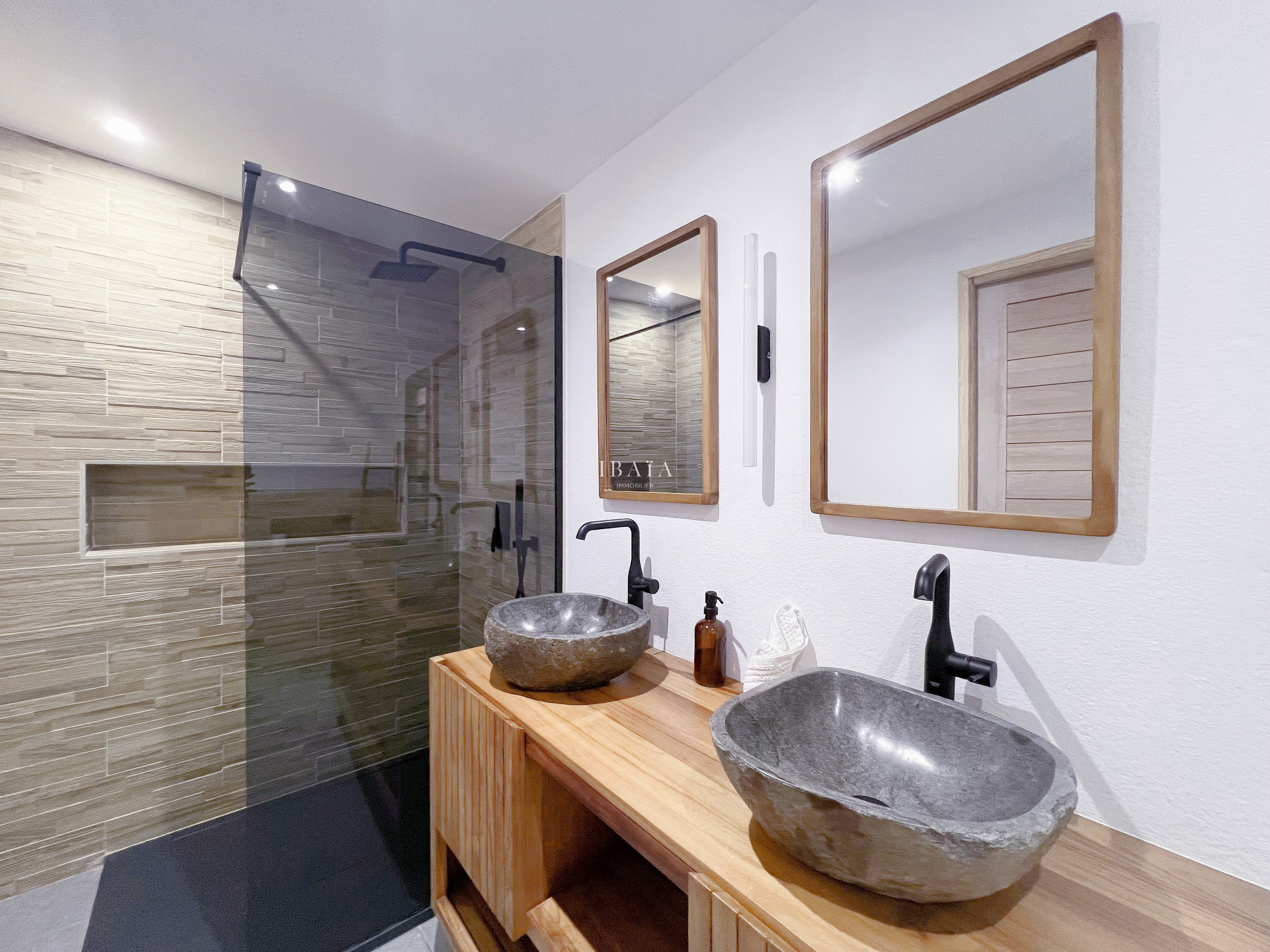 · A sumptuous air-conditioned 80 m² master suite on the upper floor, with a king-size bed and an adjoining bathroom featuring a double sink and a large walk-in shower