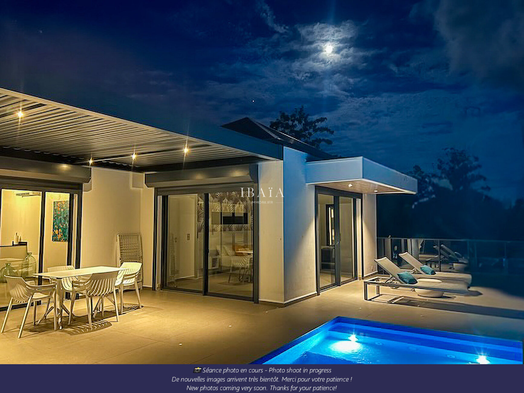 However, it is the terrace that represents the heart of this high·end villa. Protected by a bioclimatic pergola, it is the perfect place for family meals or aperitifs with friends. The punch tank, also a jacuzzi, invites you to relax and allow you to contemplate the surrounding nature.