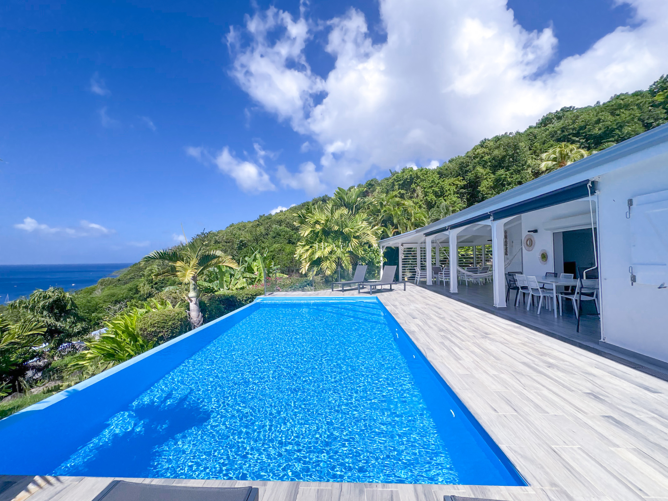 Desde las alturas de Bouillante, esta dirección excepcional se encuentra solo a unos minutos de la playa de arena negra volcánica de Malendure y combina intimidad y naturaleza con un acceso directo a los más hermosos tesoros marinos de Guadalupe.