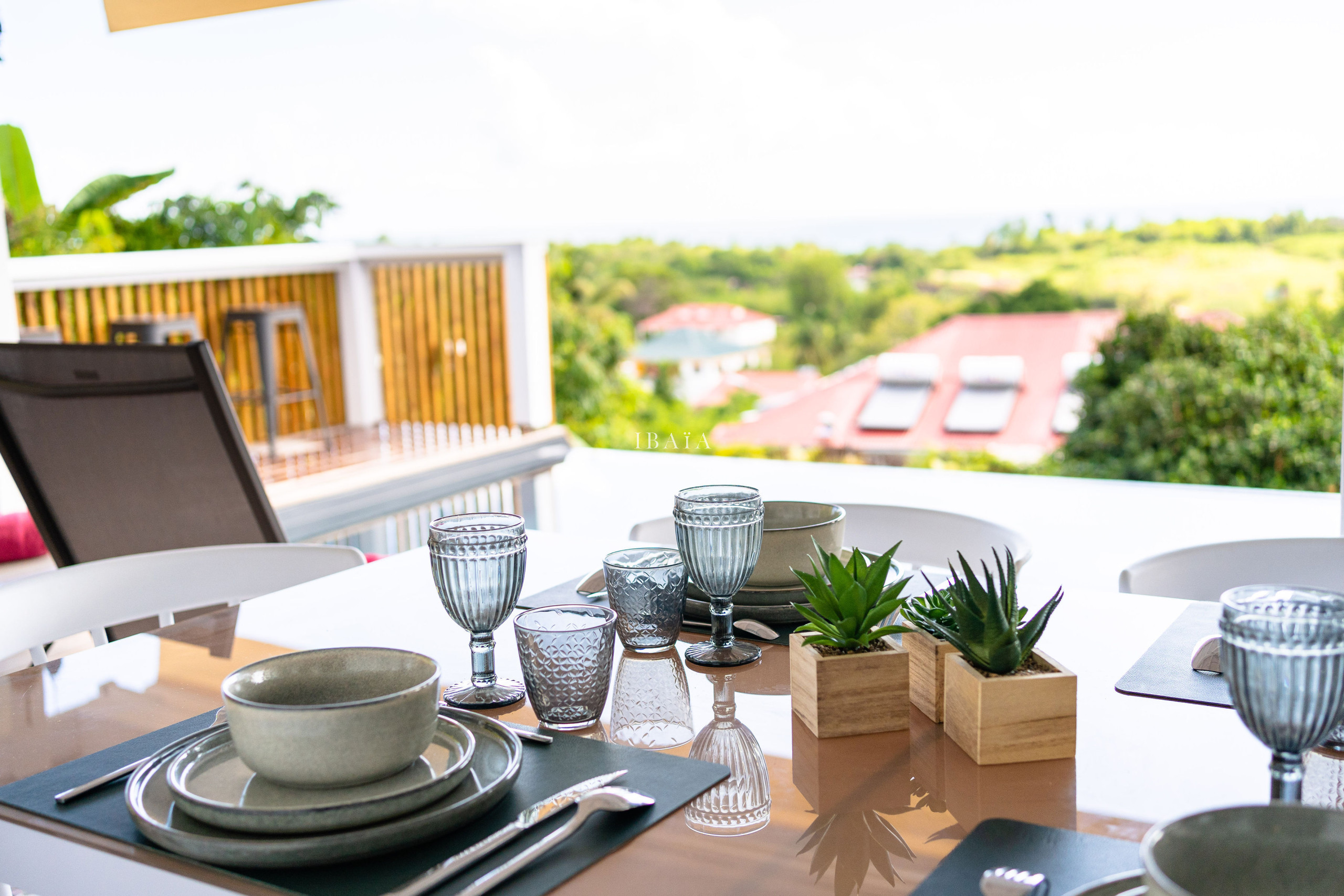 Nuestro favorito absoluto: la terraza frente al horizonte, ofreciendo un cuadro impresionante donde se destacan los relieves de Les Saintes, la silueta de Dominica y la lejana Guadalupe. En la hora dorada, el cielo se viste de ocre y coral, transformando cada final de día en un momento mágico... un privilegio raro que solo Ti Moca sabe ofrecer con tanta suavidad e intimidad.