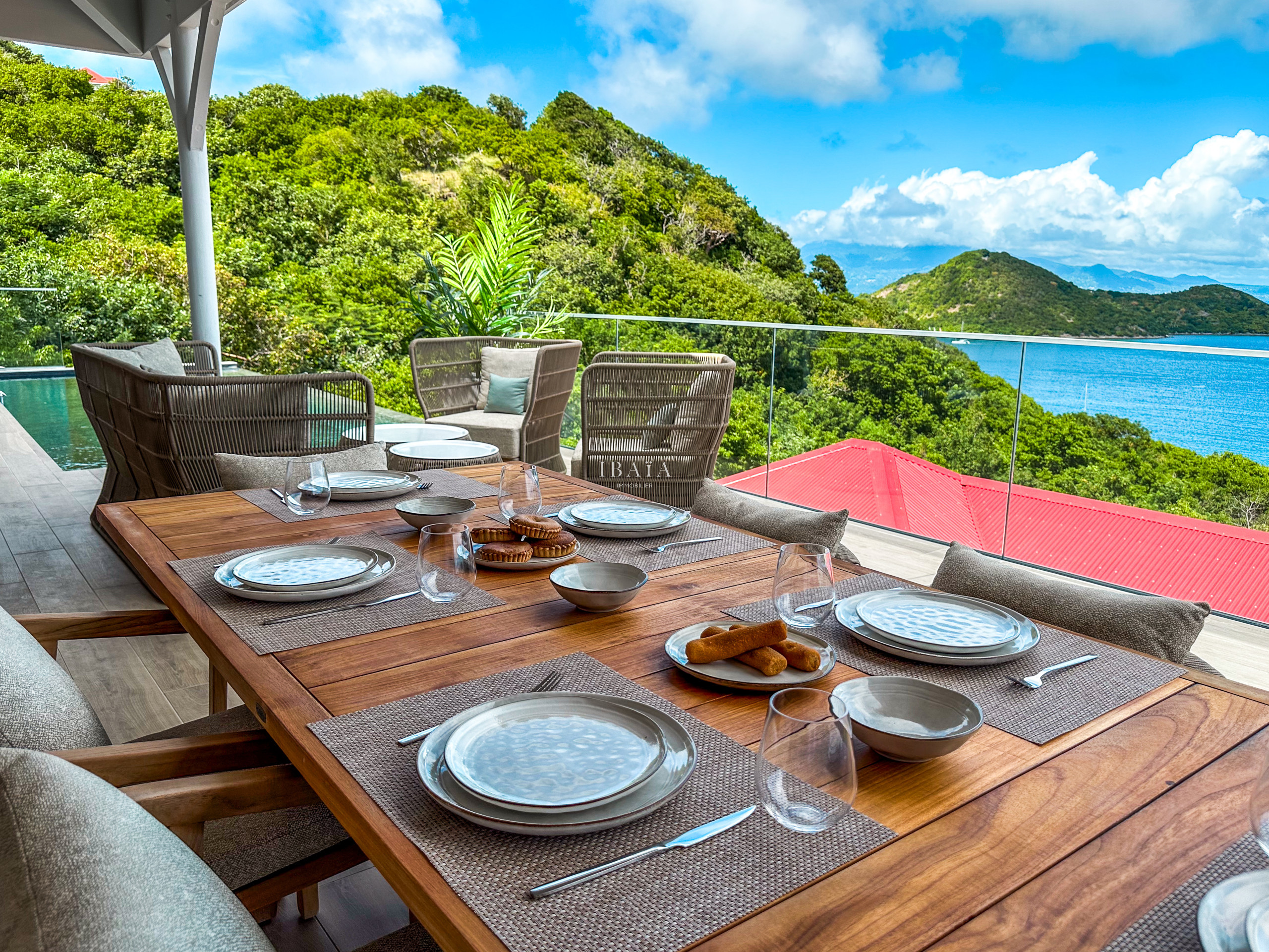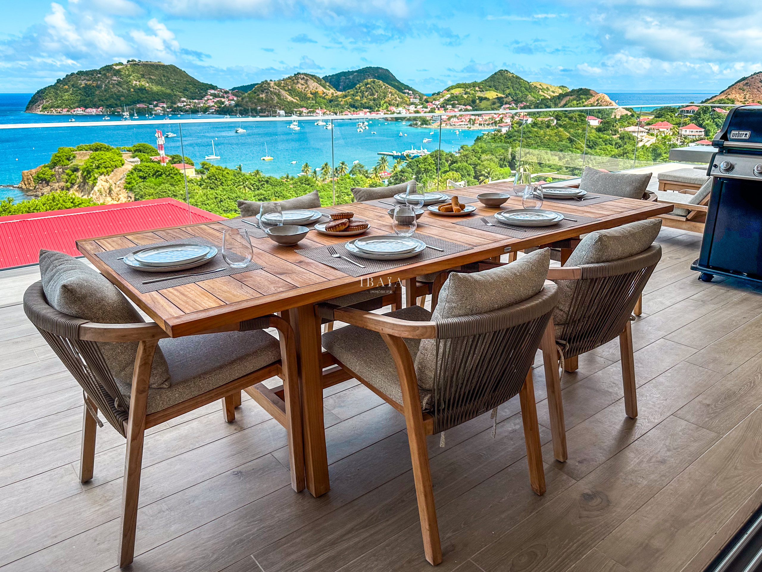 · Una hermosa terraza sombreada abierta a un panorama tropical con una gran mesa para 8 comensales, ideal para sus comidas bajo la brisa de los alisios