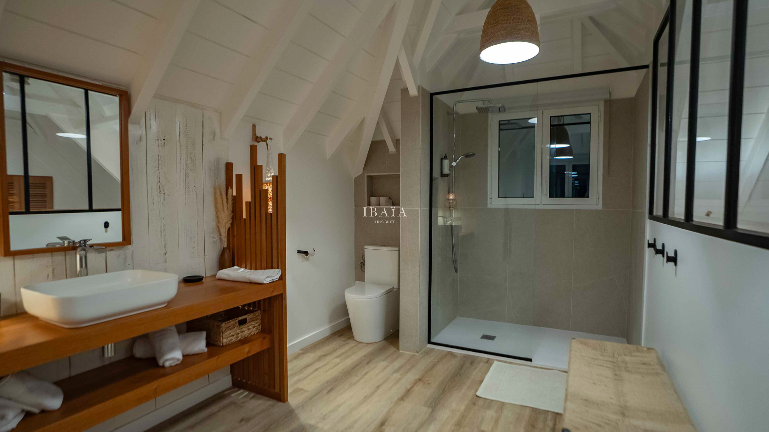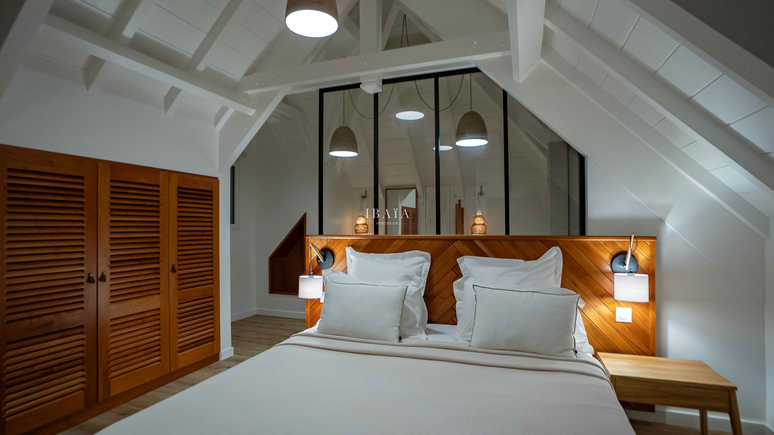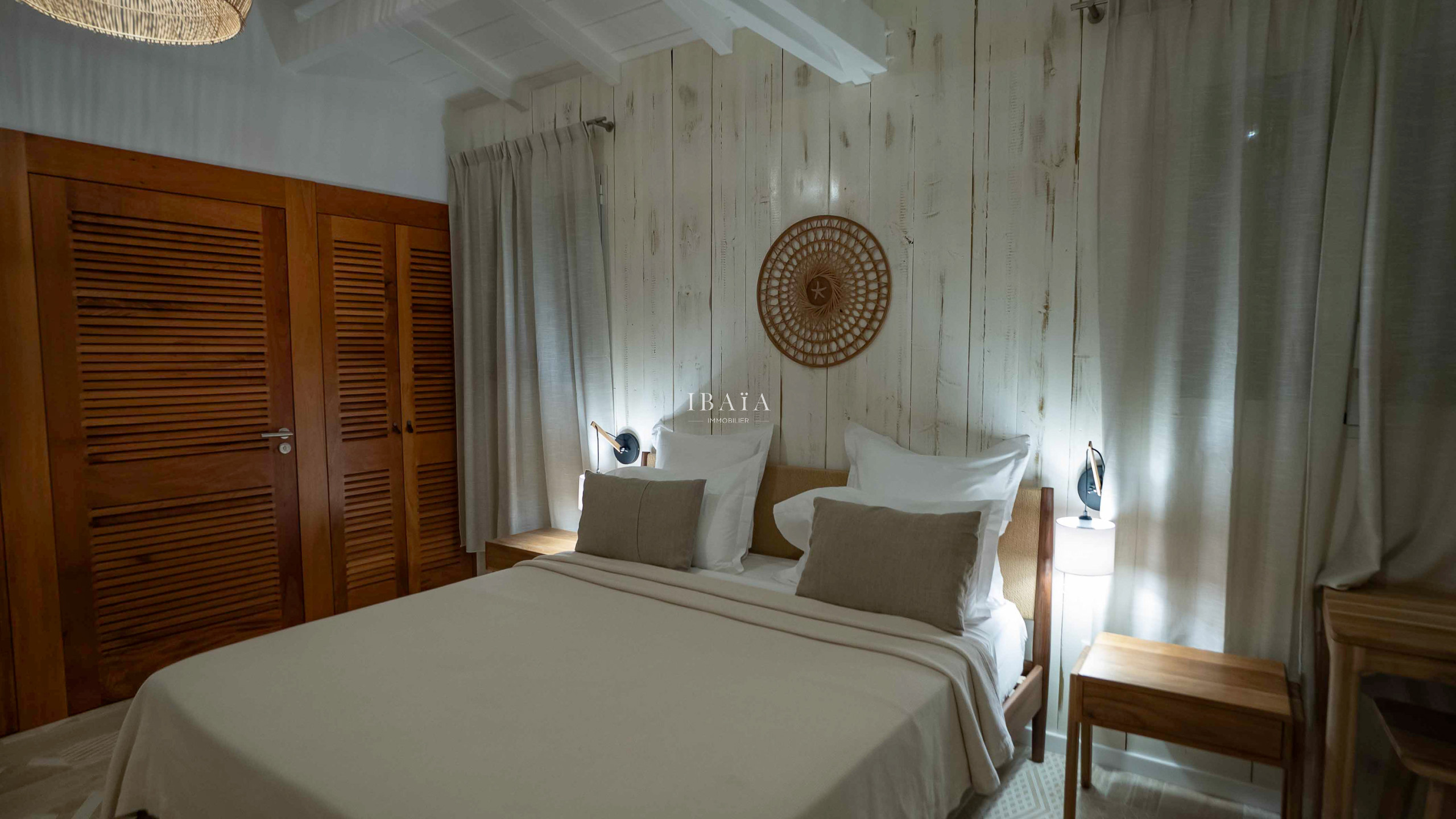 Espaciosa y elegantemente distribuida, la Villa Reflet des Saintes es ideal para familias numerosas, estancias entre amigos o grupos de hasta 10 personas. Ofrece un perfecto equilibrio entre espacios compartidos acogedores y privacidad absoluta, gracias a sus cinco habitaciones con baños adjuntos. Aquí, cada momento se vive al ritmo de los alisios, en una atmósfera tranquila e íntima, a solo unos pasos de los más hermosos tesoros de Terre-de-Haut.