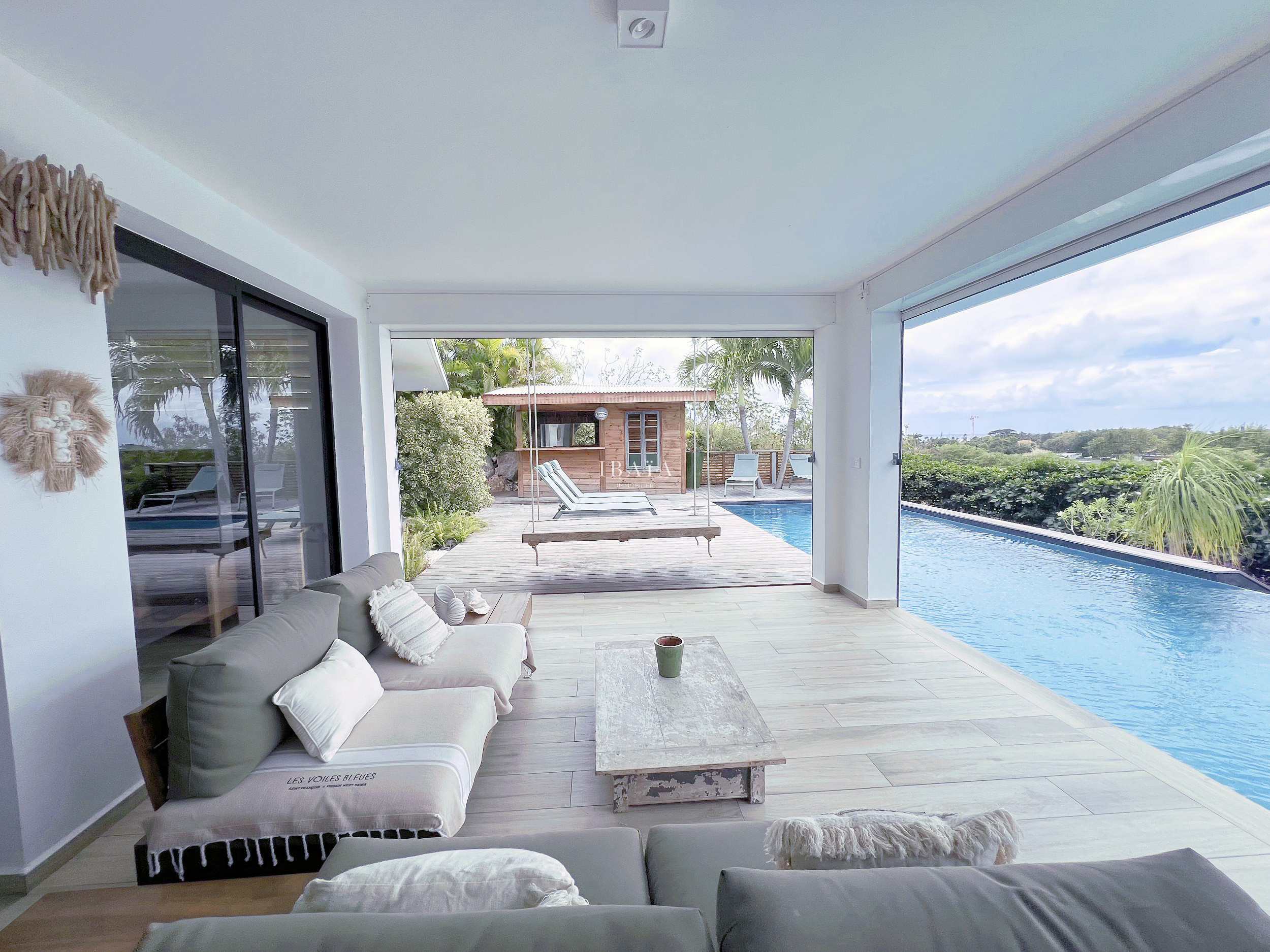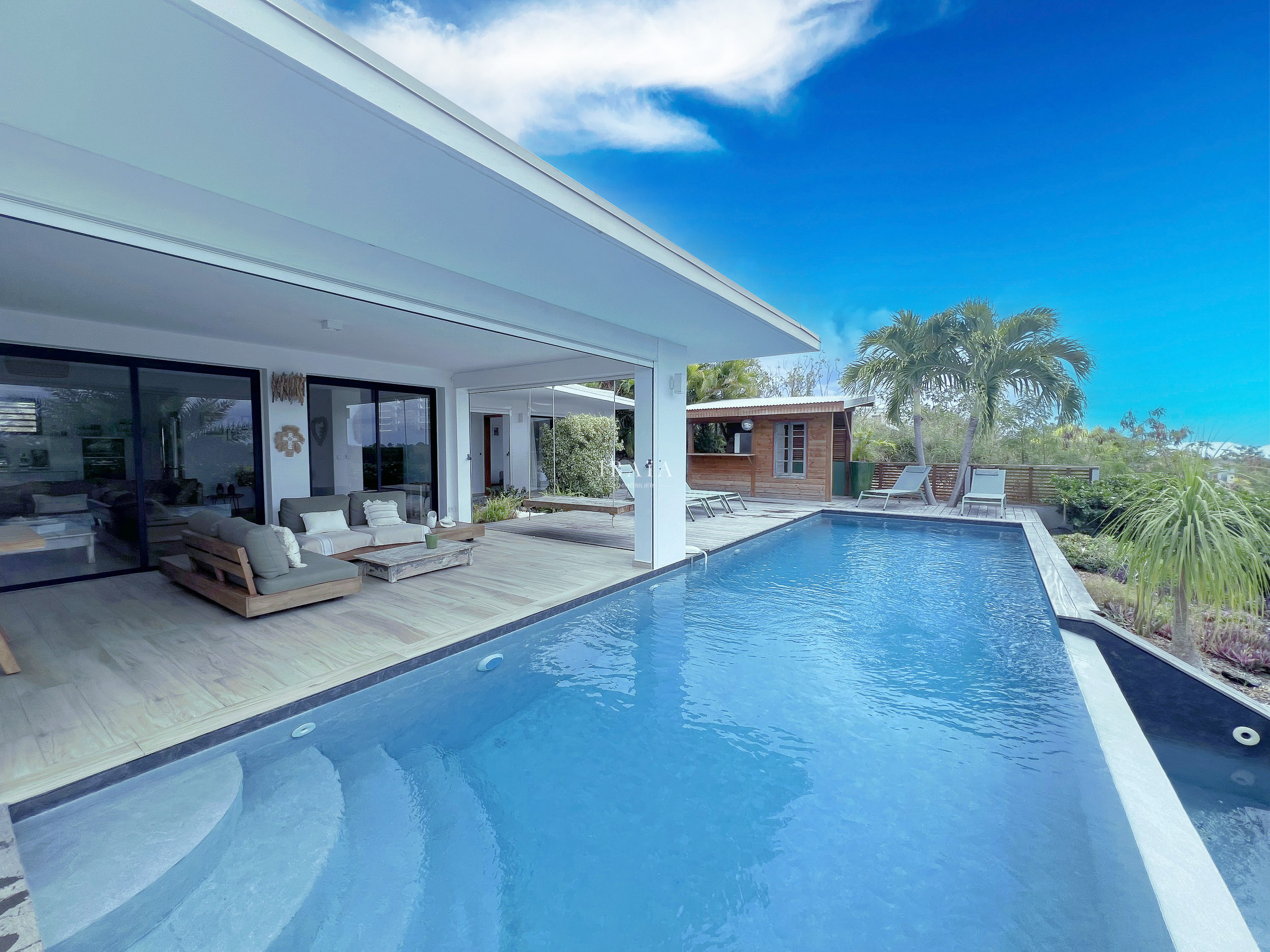 Situada en la prestigiosa residencia segura Belles Rives, la Villa Rives d'Or encarna maravillosamente la alianza del refinamiento contemporáneo y el encanto tropical. Ofreciendo un panorama espectacular sobre el mar y el aeródromo de Saint-François, esta propiedad excepcional promete una experiencia única, entre serenidad, elegancia y emociones.