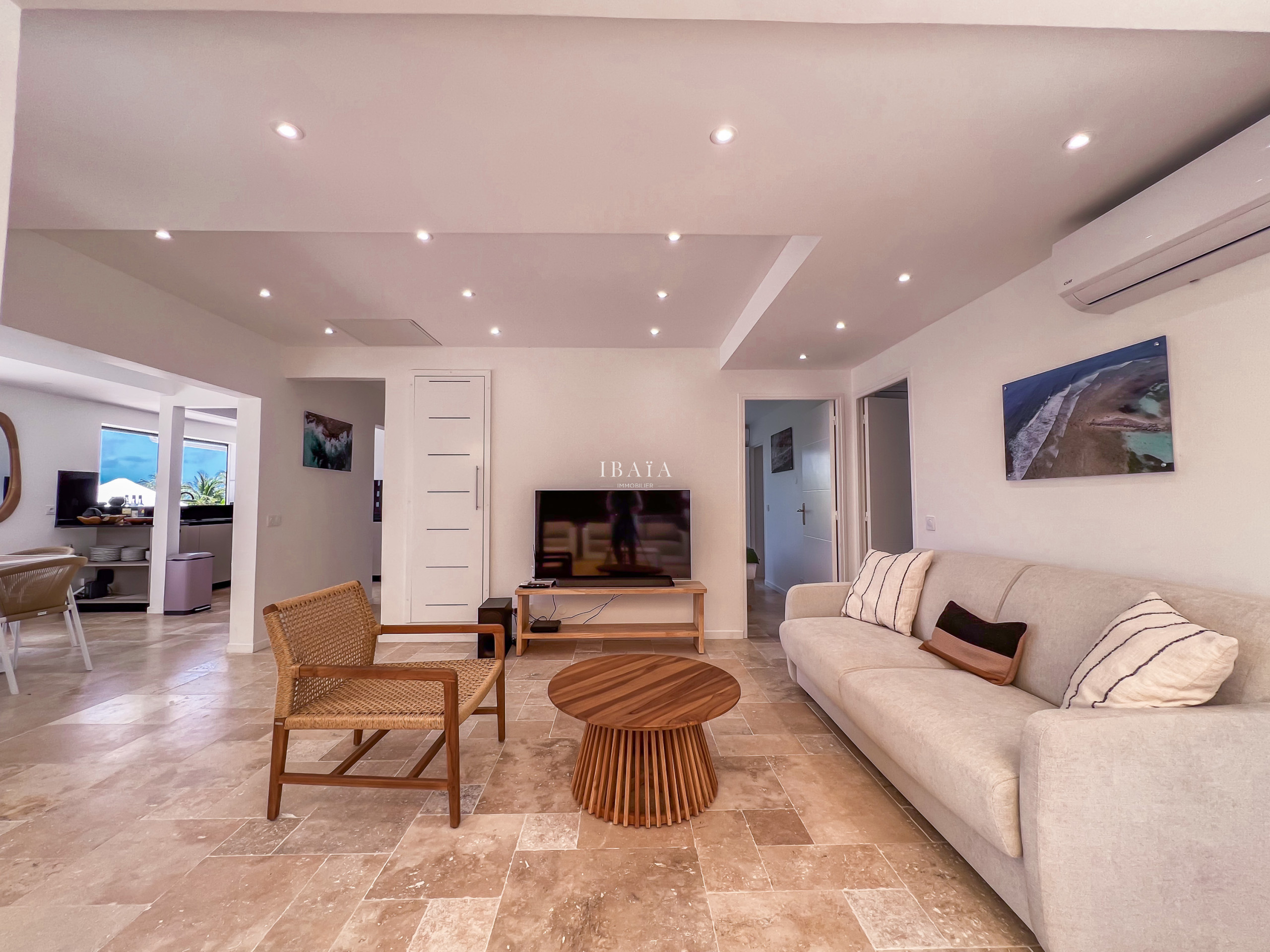 El amplio salón con aire acondicionado, equipado con un sofá convertible, puede acomodar a dos huéspedes adicionales (niños). La moderna cocina americana, totalmente equipada, se abre al comedor y a las terrazas, ofreciendo un espacio acogedor para preparar y compartir comidas.