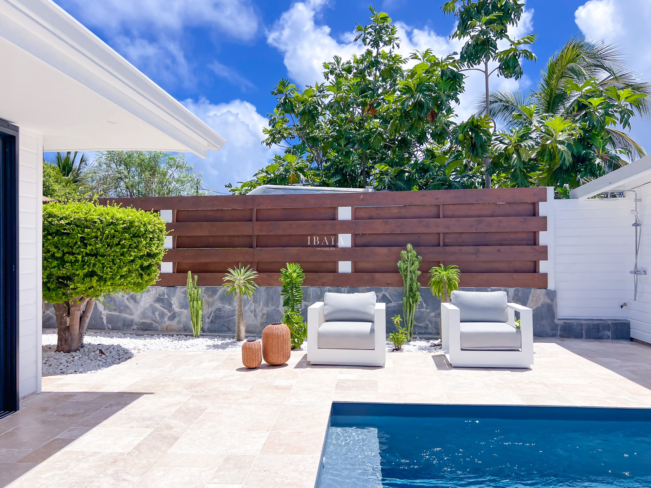 En el exterior, un generoso jardín de 1.400 m² alberga una piscina privada, ideal para relajarse y disfrutar del clima tropical de Guadalupe.