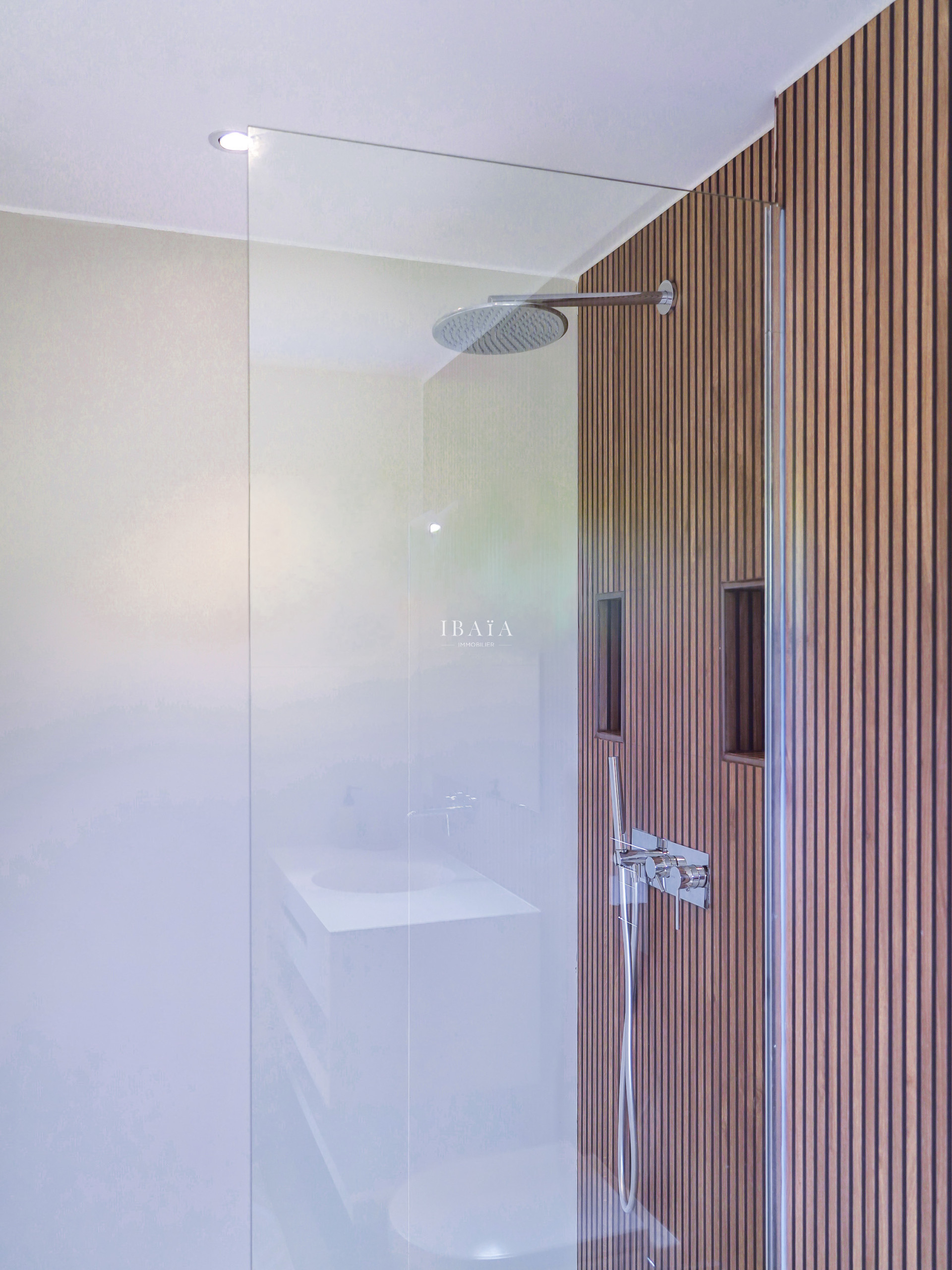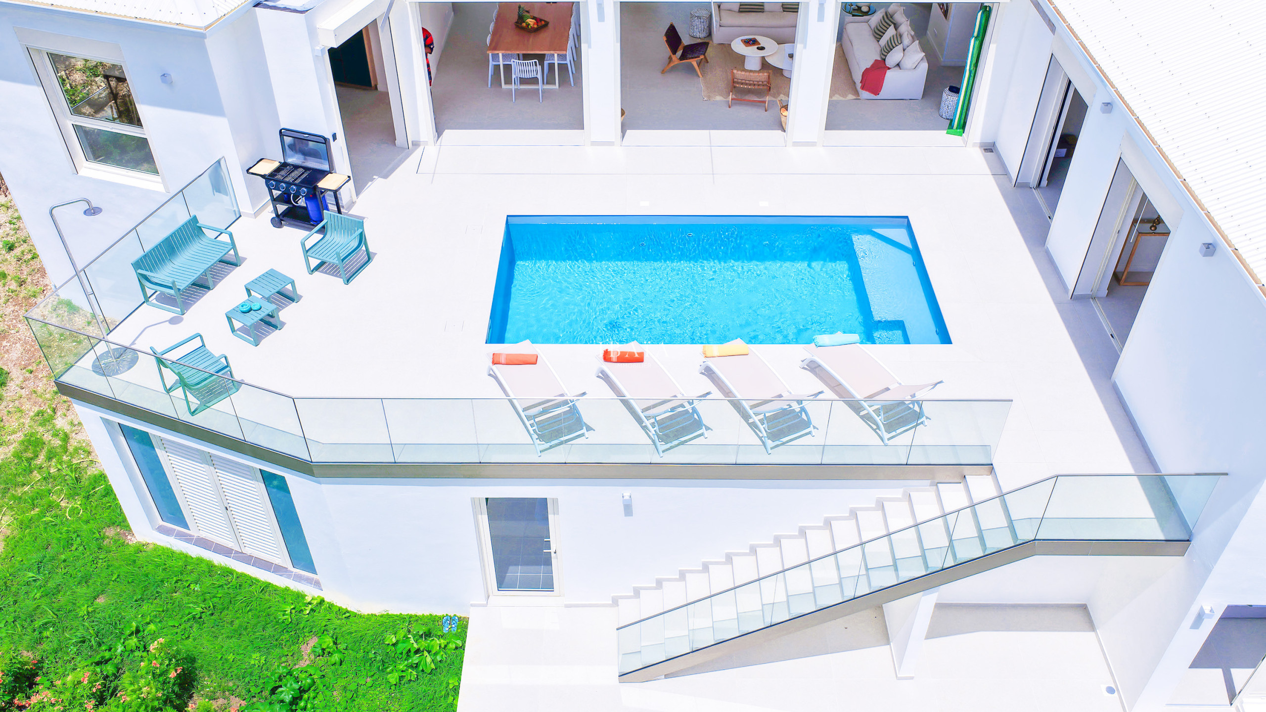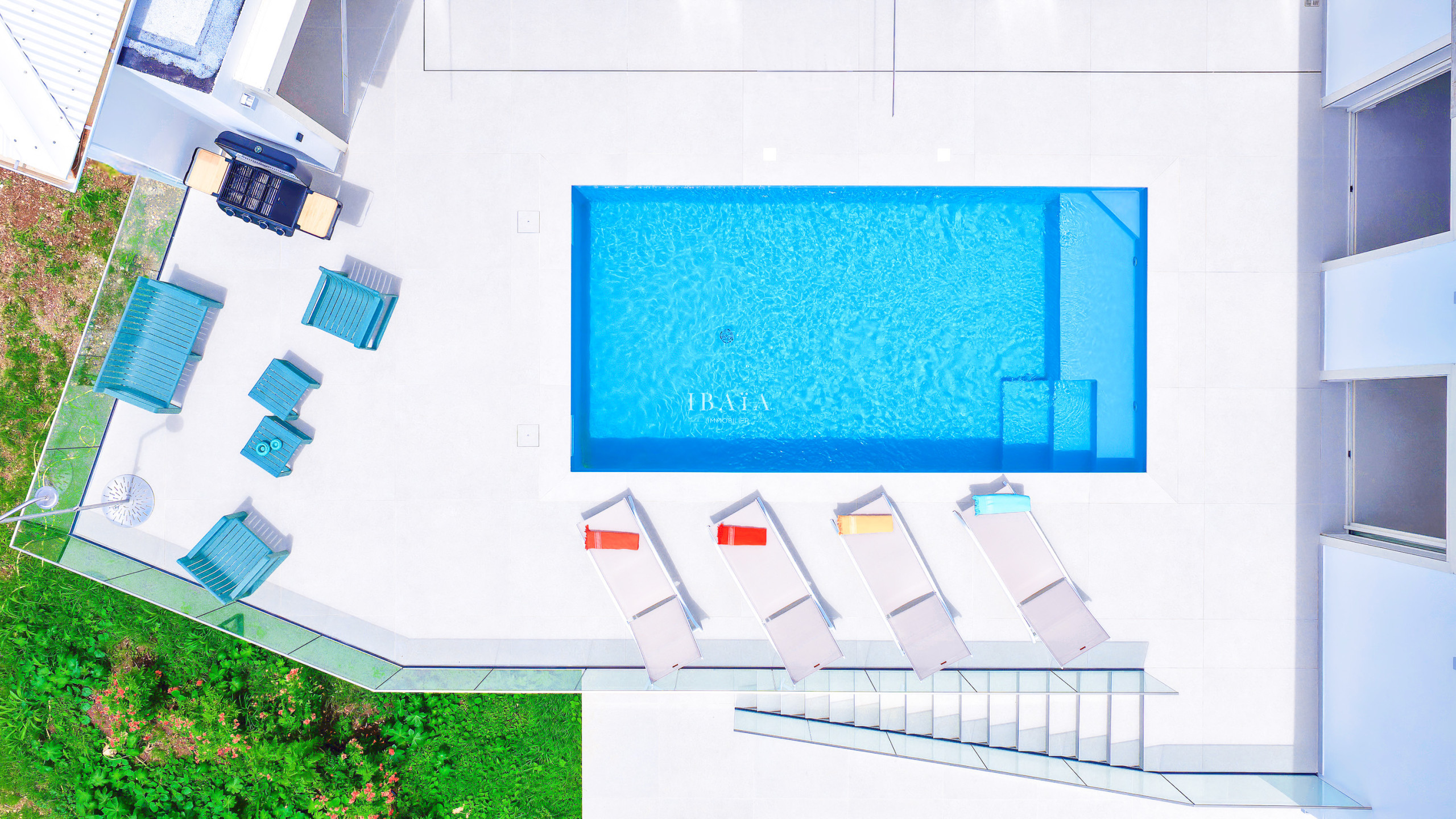 · Piscina de agua salada (18 m²) con alarma sumergida, rodeada de 8 tumbonas y ducha exterior