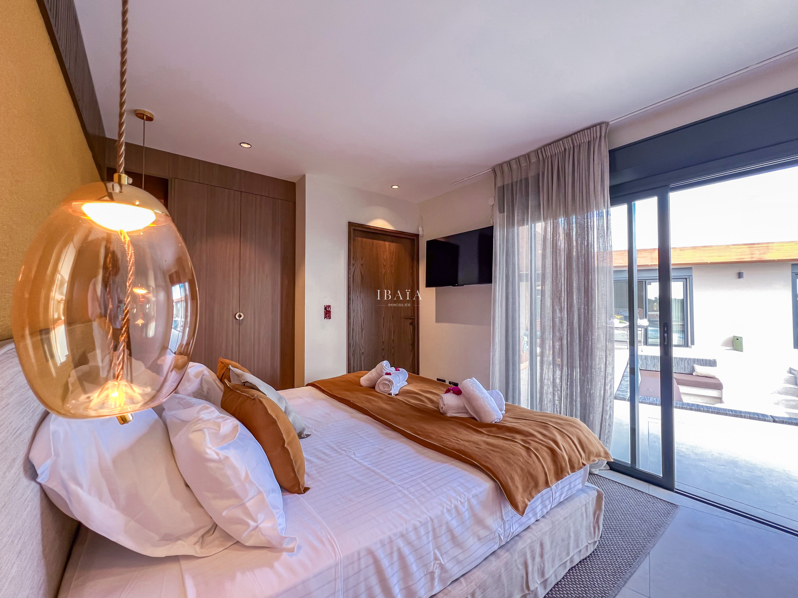 La villa dispone de 4 dormitorios con aire acondicionado, incluidas 2 master suites con su propio cuarto de baño con ducha, espacio de almacenamiento y acceso directo a la piscina. Otros dos dormitorios, uno doble y otro con dos camas individuales, comparten un baño.