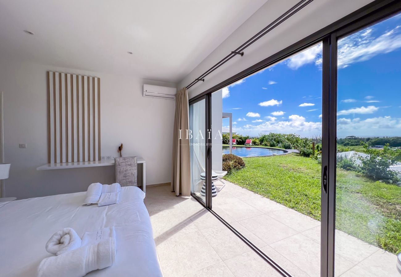 En el exterior, gracias a su posición dominante, la villa ofrece una vista panorámica del océano. Su amplio jardín alberga una piscina privada de 40 m² y una terraza cubierta, ideal para relajarse y disfrutar de un entorno excepcional.