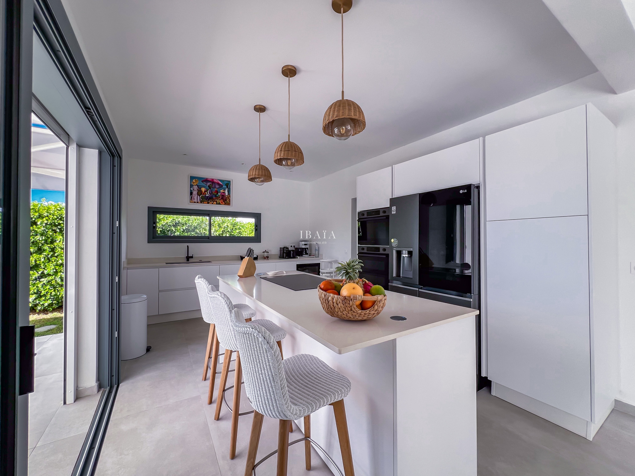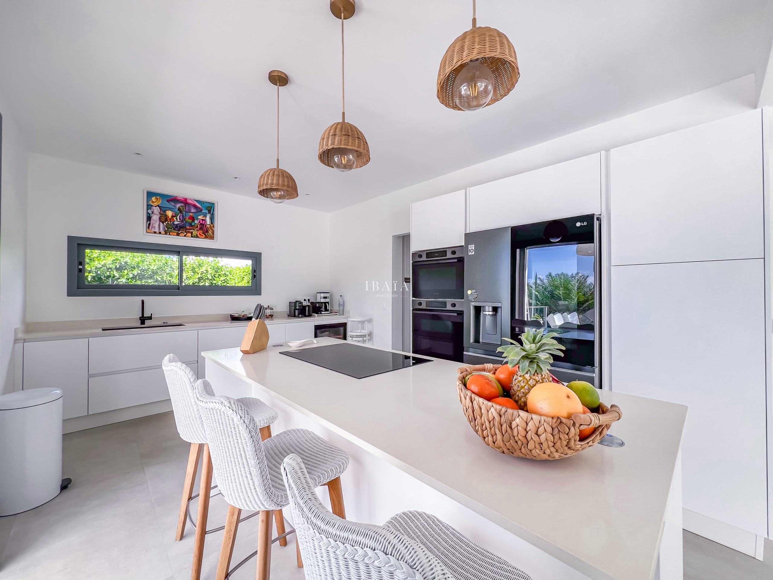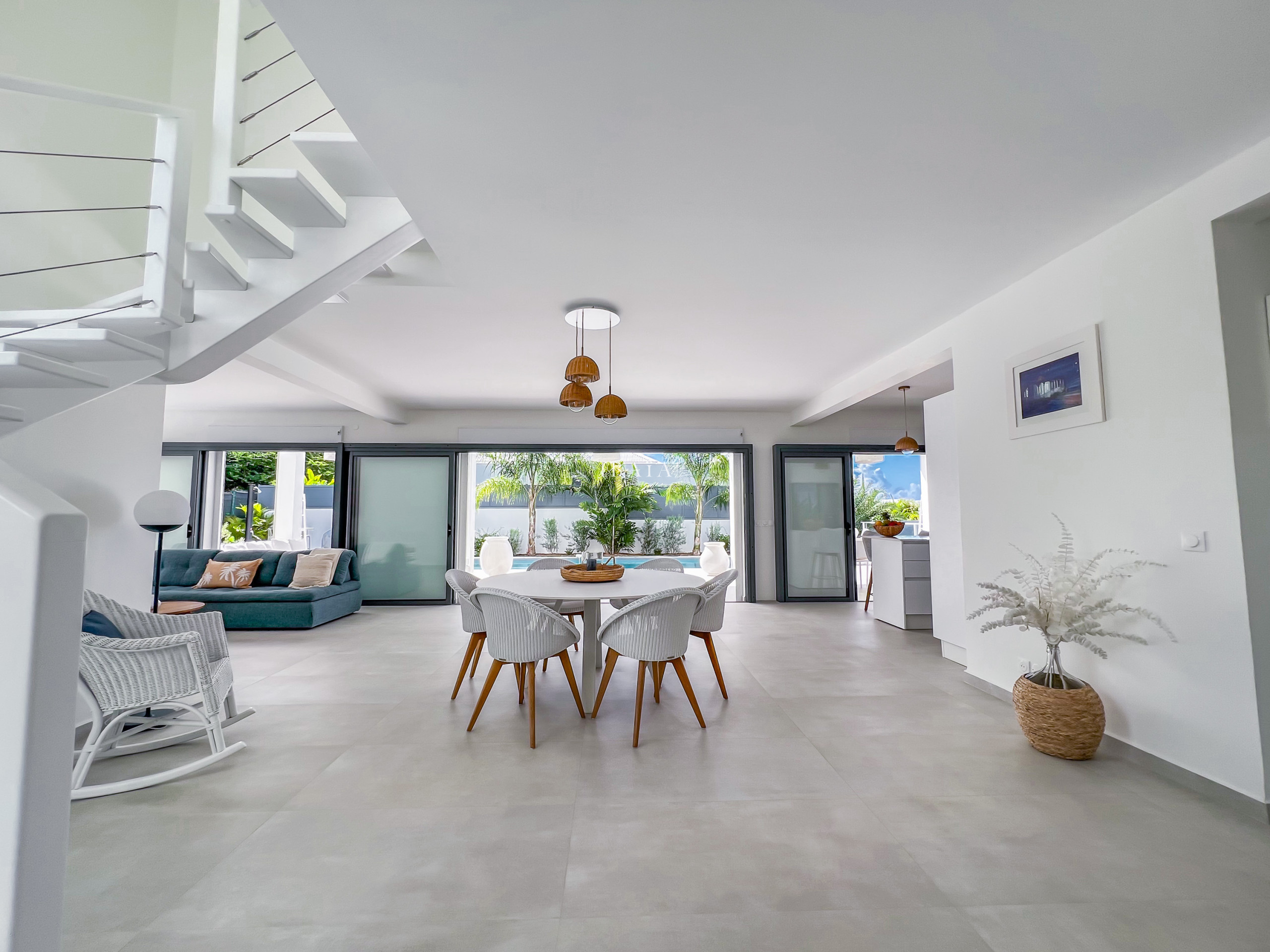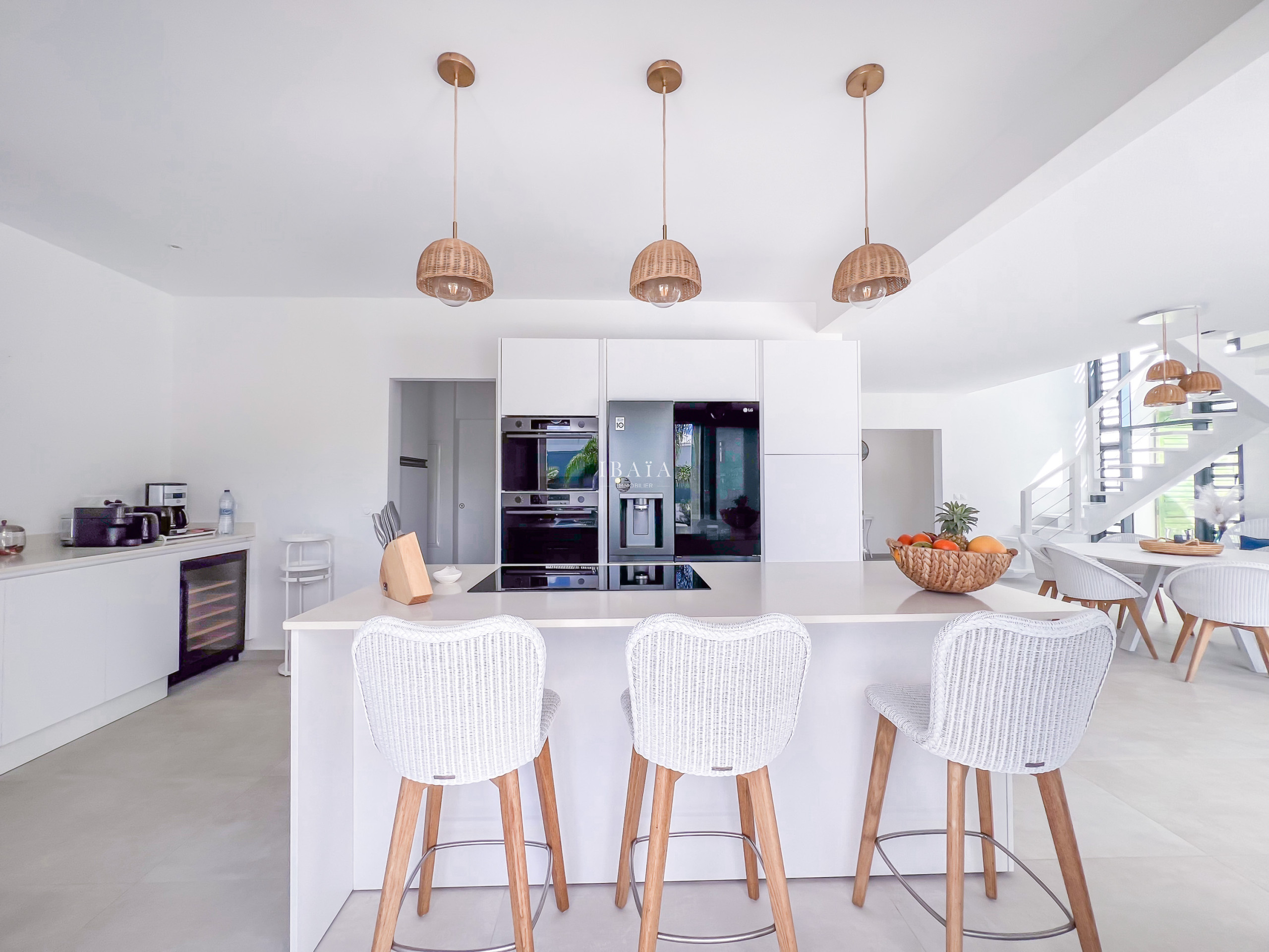 Cada espacio de esta villa está bañado de luz, gracias a sus grandes aperturas al exterior. Al entrar, le recibirá un gran salón, compuesto por salón y cocina americana totalmente equipada.