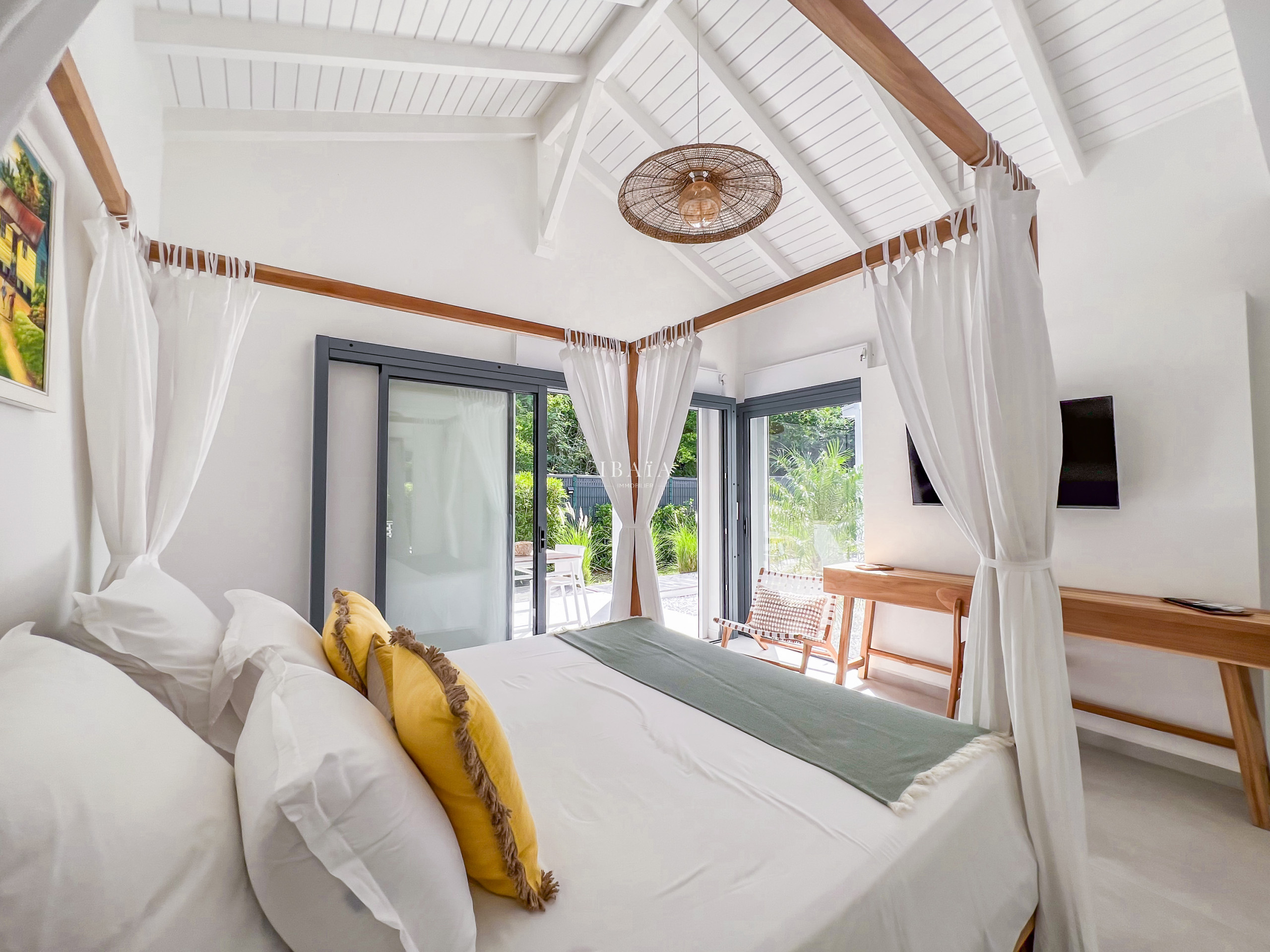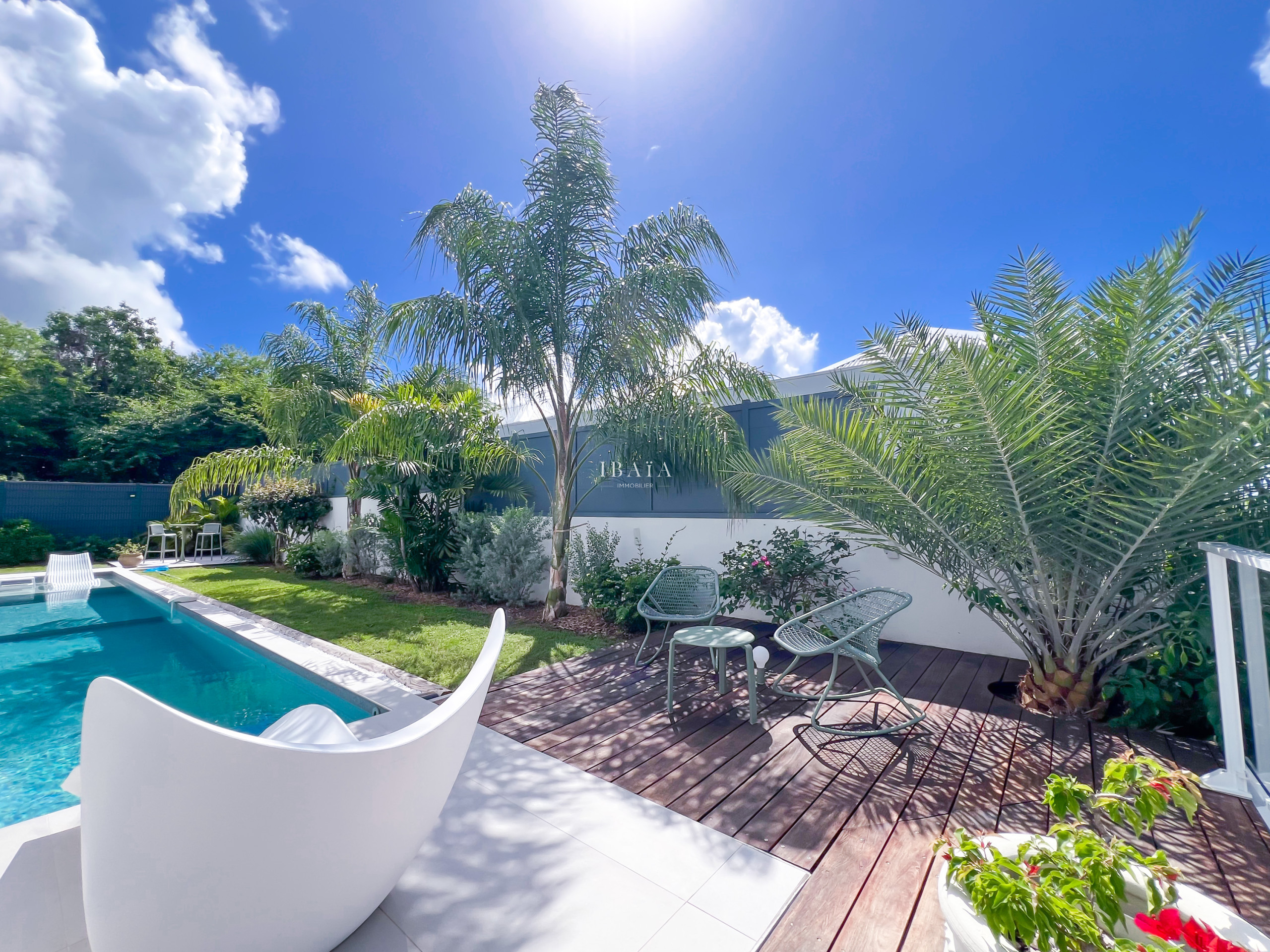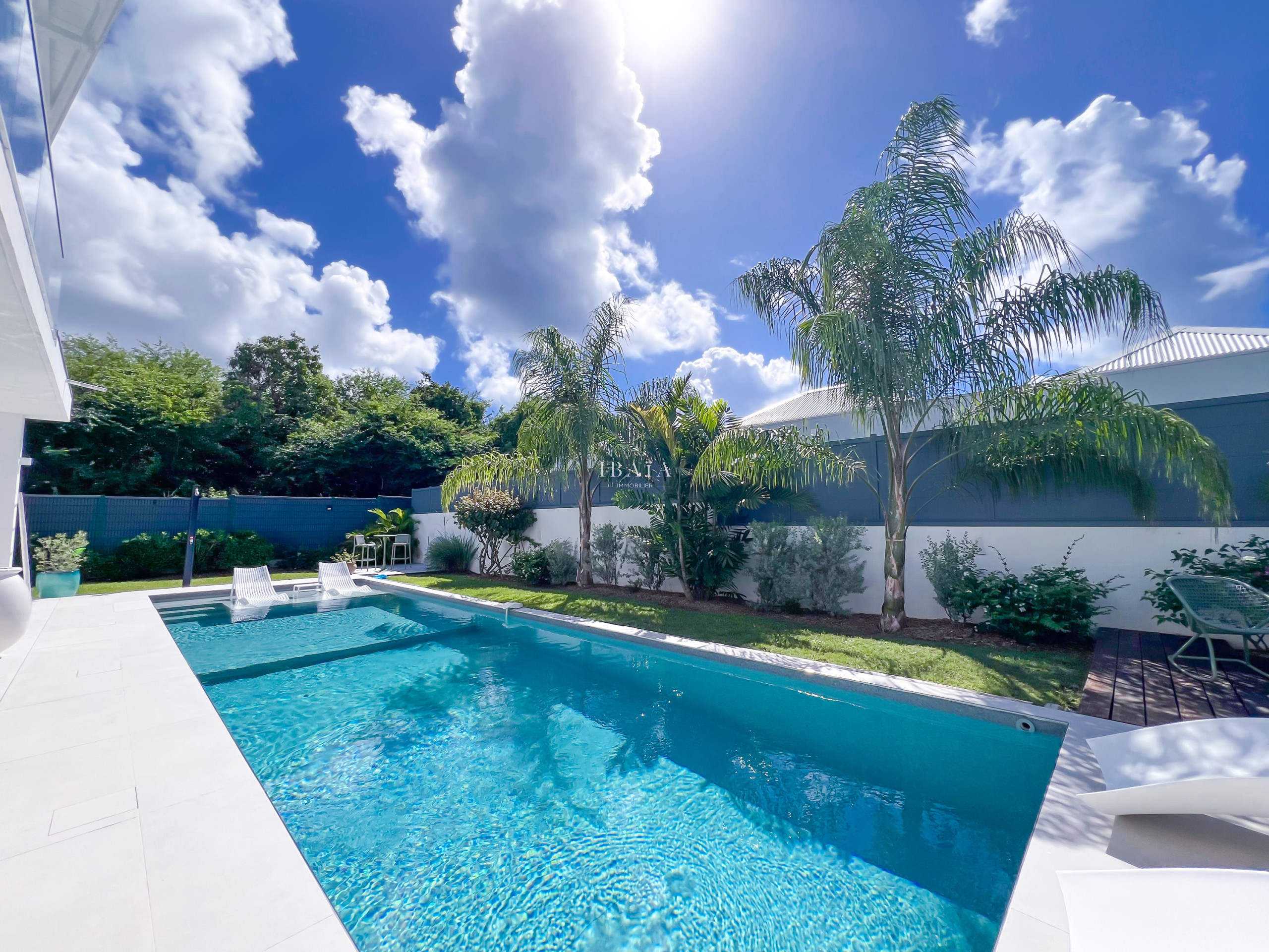 En el exterior, un generoso jardín de 1.400 m² alberga una piscina privada, ideal para relajarse y disfrutar del clima tropical de Guadalupe.