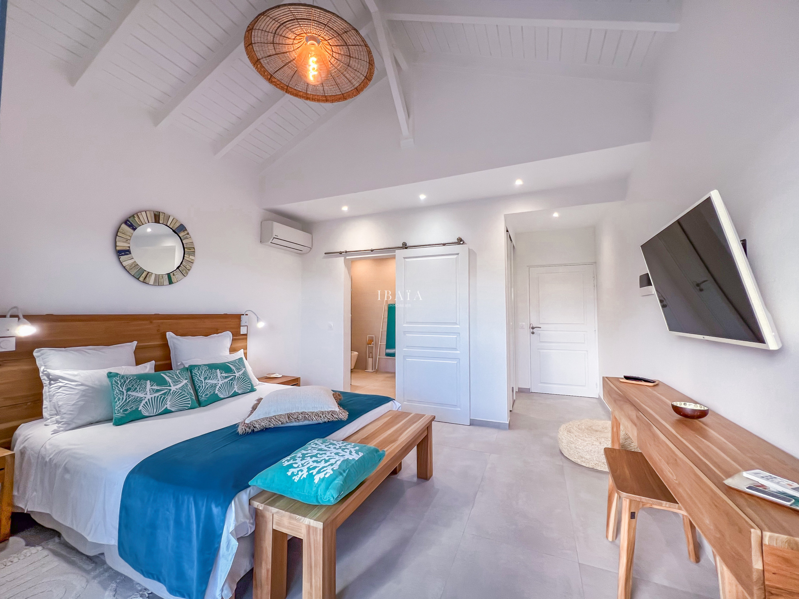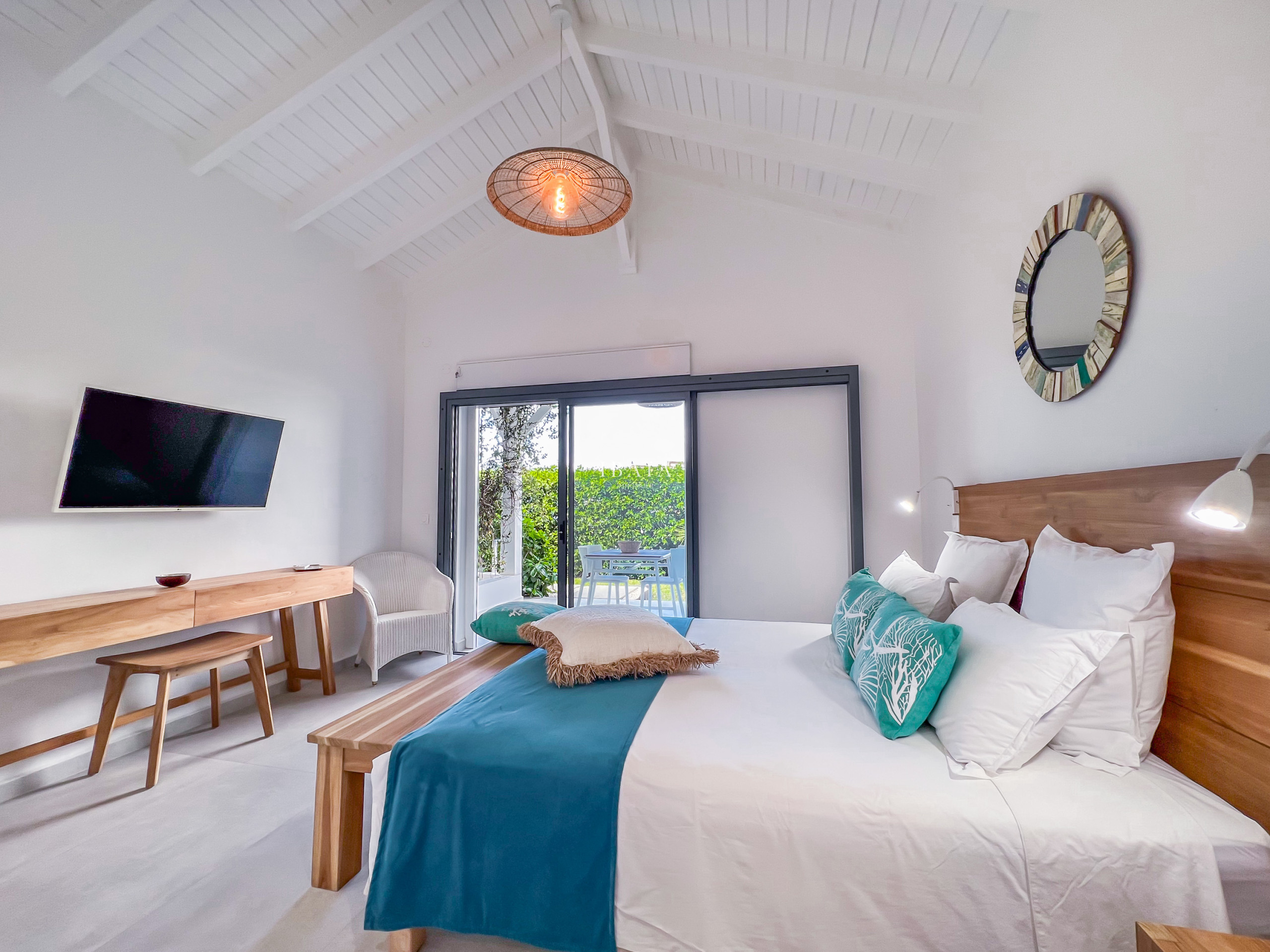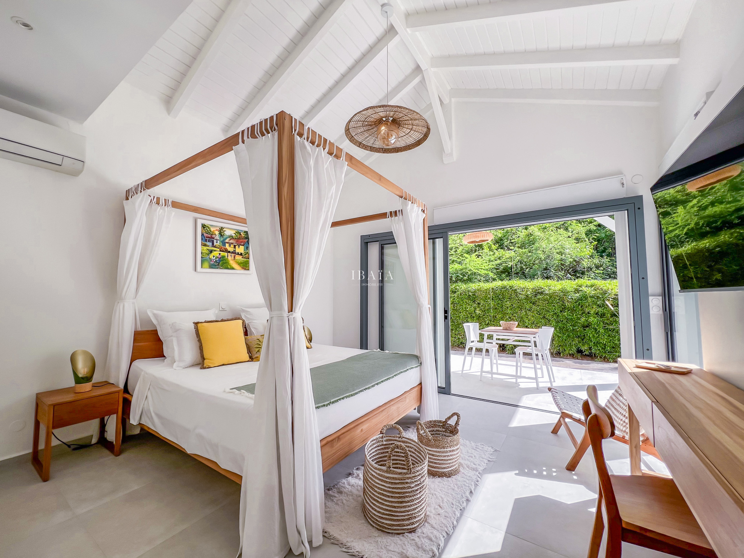 En el exterior, un generoso jardín de 1.400 m² alberga una piscina privada, ideal para relajarse y disfrutar del clima tropical de Guadalupe.