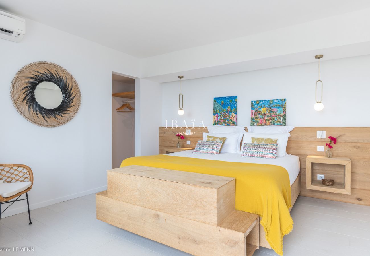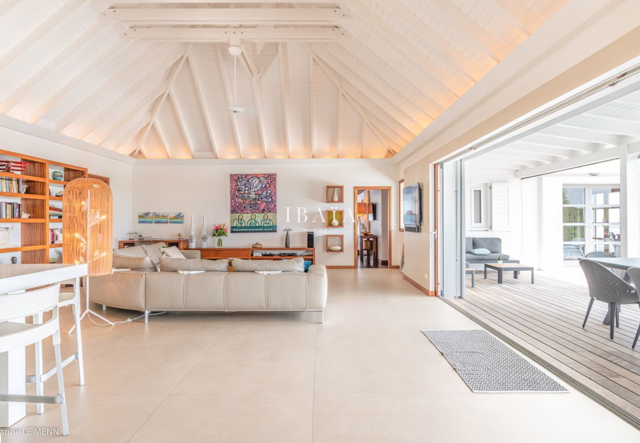 La villa en San Bartolomé posee 4 dormitorio(s) y capacidad para 8 personas. Alojamiento de 180 m² acogedor y muy luminoso. Está ubicado en una zona ideal para familias y junto al mar.Dispone de caja fuerte, acceso internet (wifi), secador, aire acondicionado en todos los dormitorios, piscina climatizada privada, 5 Televisores, tv satelite (Idiomas: Inglés, Francés).La cocina americana, de inducción, está equipada con nevera, microondas, horno, congelador, lavavajillas, vajilla/cubertería, utensilios/cocina, cafetera, tostadora, hervidor de agua y exprimidor.