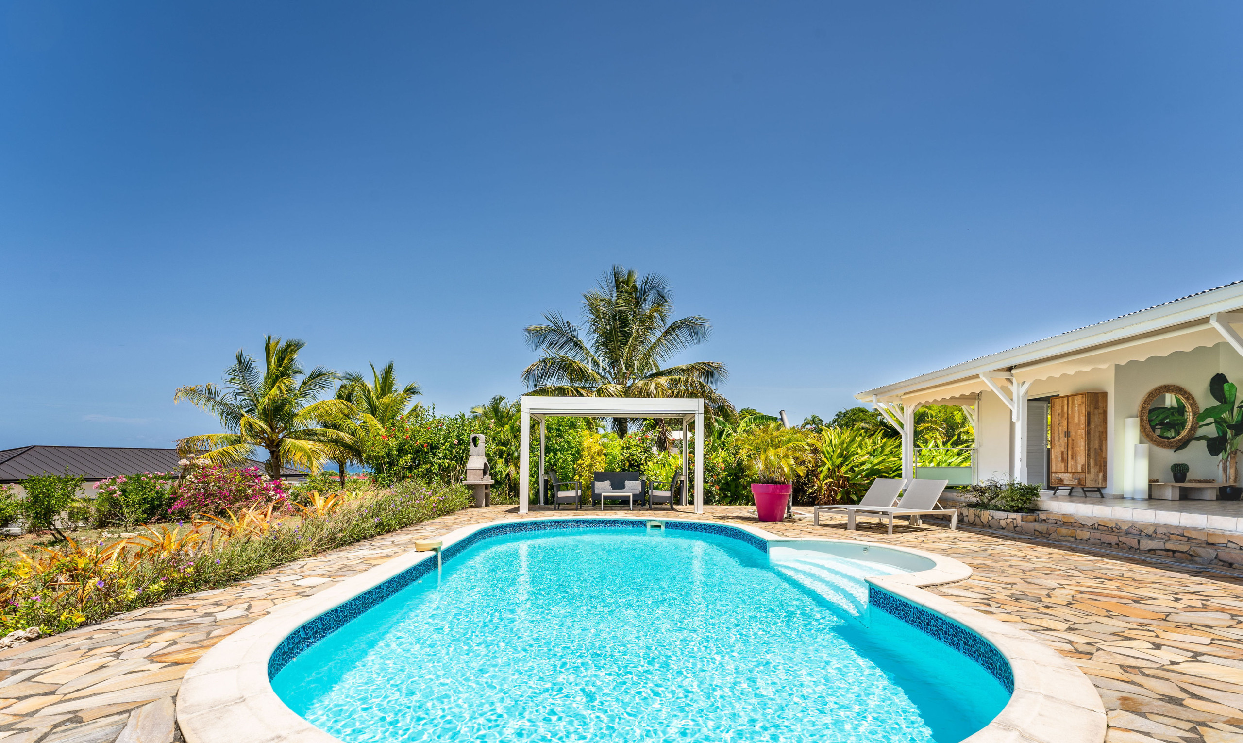 À la Villa Margaux, le paradis prend des couleurs éclatantes : le bleu profond de la mer des Caraïbes, le vert vibrant d’un jardin tropical et le doré somptueux des couchers de soleil qui embrasent l’horizon. Dès votre arrivée, vous serez captivé par sa vue exceptionnelle sur la mer, embrassant les îles voisines et des couchers de soleil spectaculaires depuis les hauteurs paisibles de Grand-Bourg à Marie-Galante.
