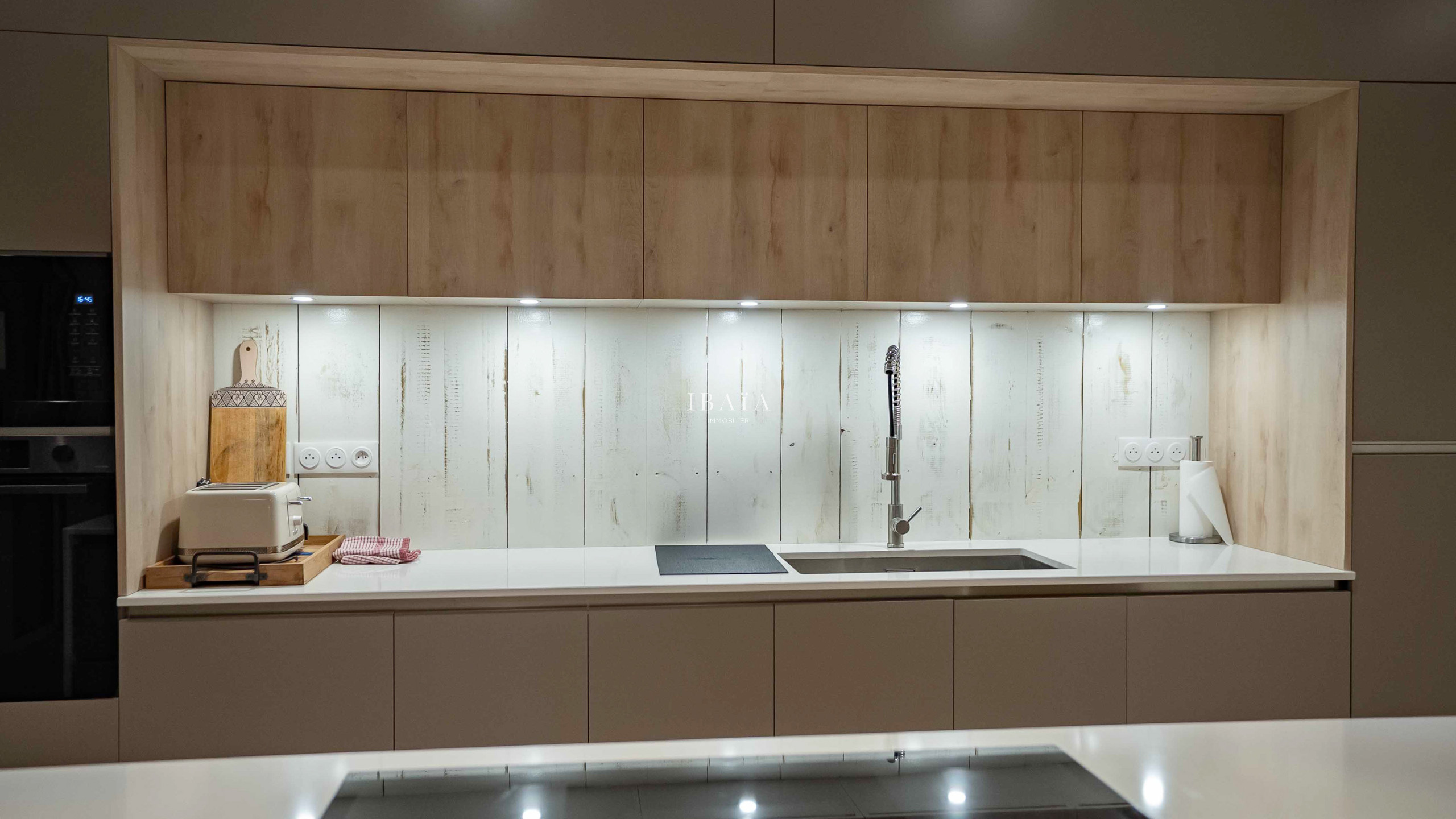· Une cuisine américaine entièrement équipée donnant sur le salon