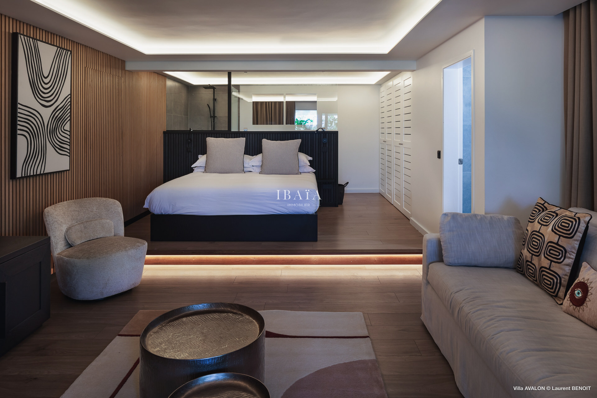 Le vaste salon lumineux s’ouvre sur la terrasse et la piscine, créant une continuité parfaite entre intérieur et extérieur. La cuisine ouverte est entièrement équipée, parfaite pour cuisiner ou faire appel à un chef privé.