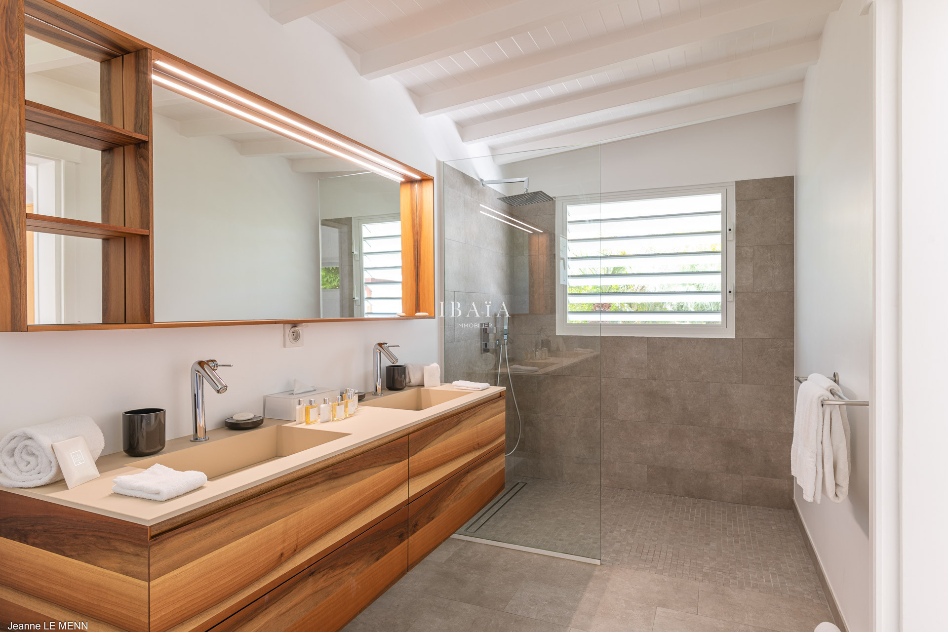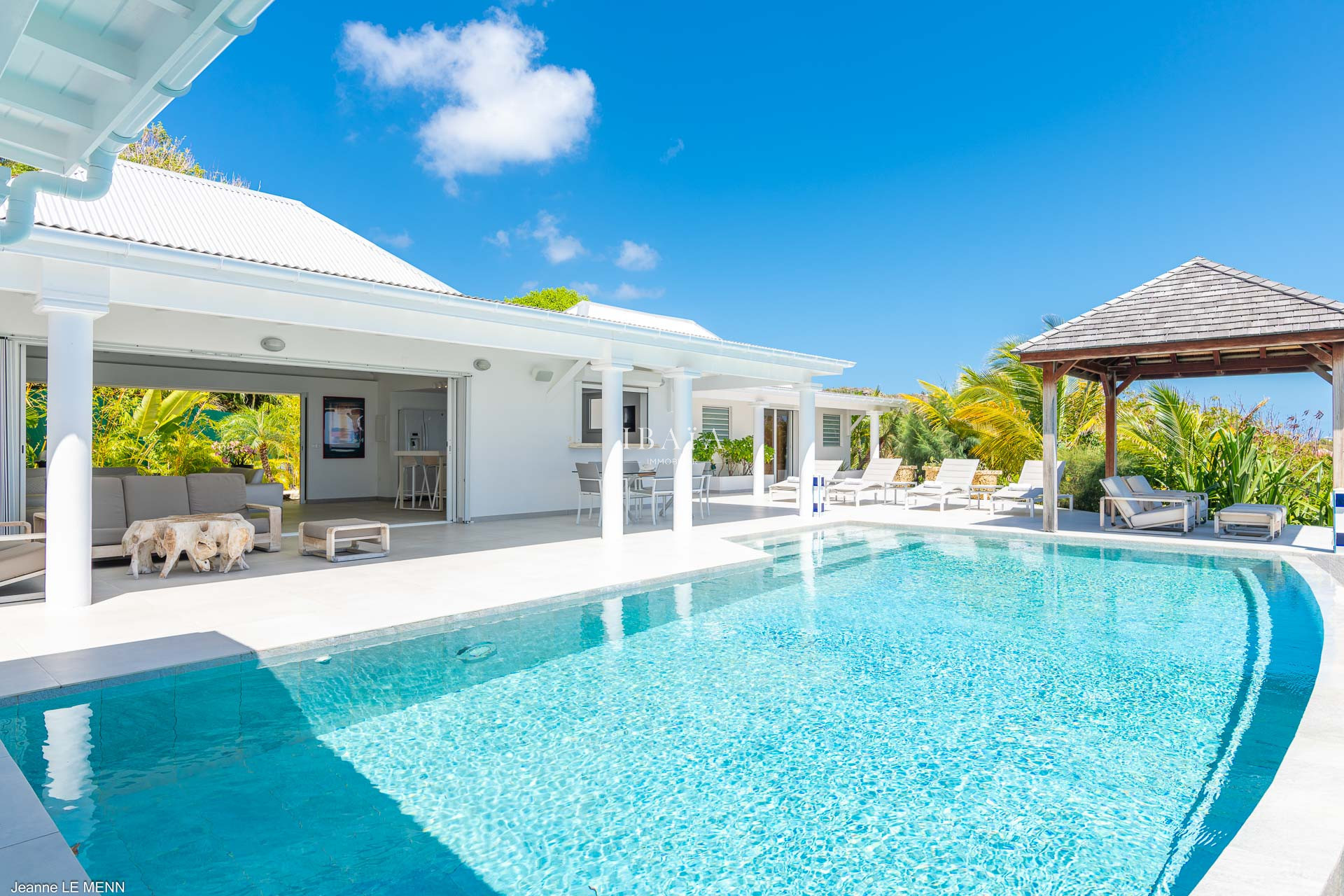 Située à quelques minutes à pied de la plage de Flamands et de l'Hotel Cheval Blanc, la villa entièrement climatisée s'articule sur 2 niveaux.
