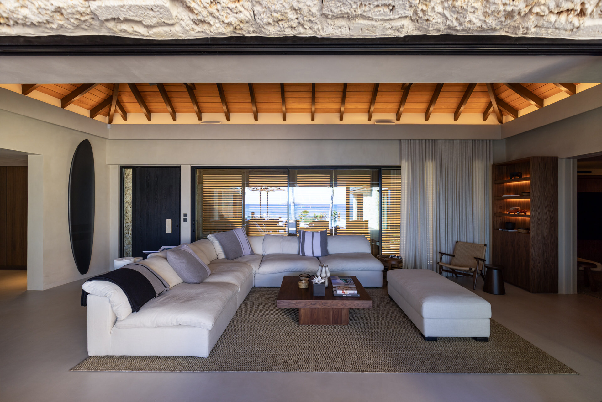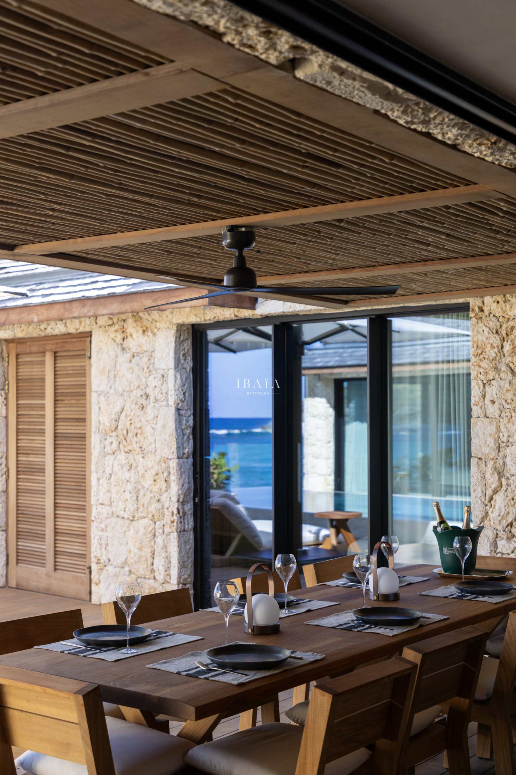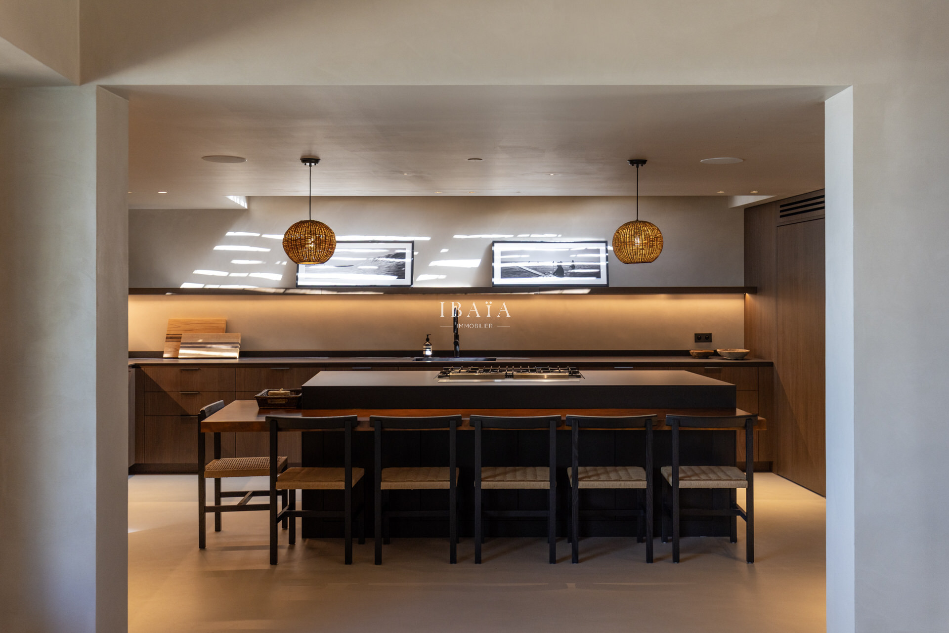 A l’entrée se trouvent la cuisine, très bien équipée et ouverte sur le salon climatisé qui offre une vue sur la piscine avec la mer en toile de fond.