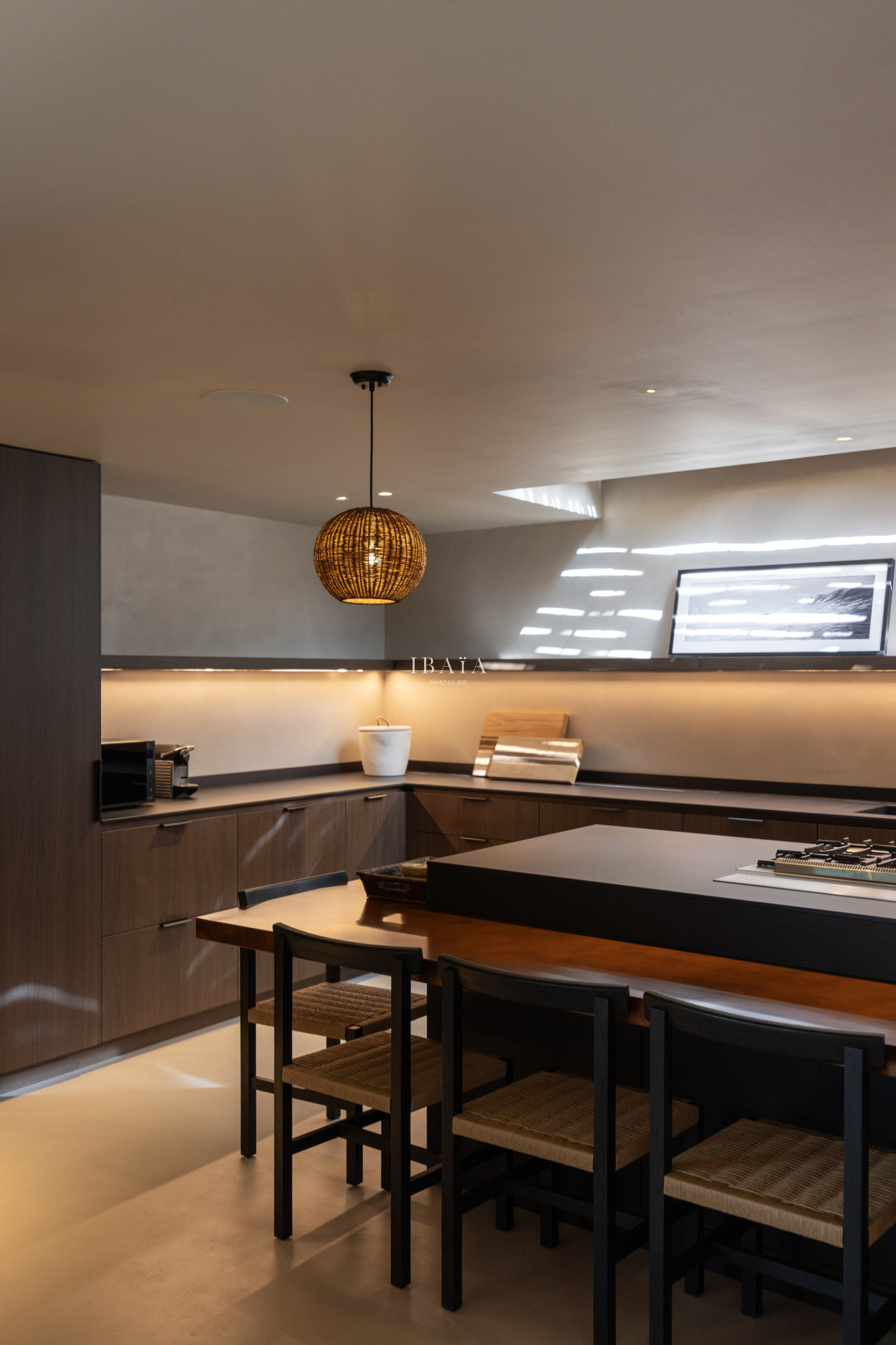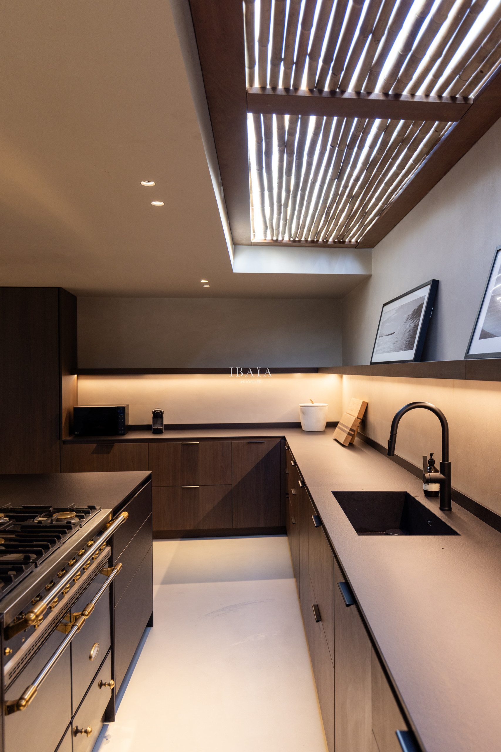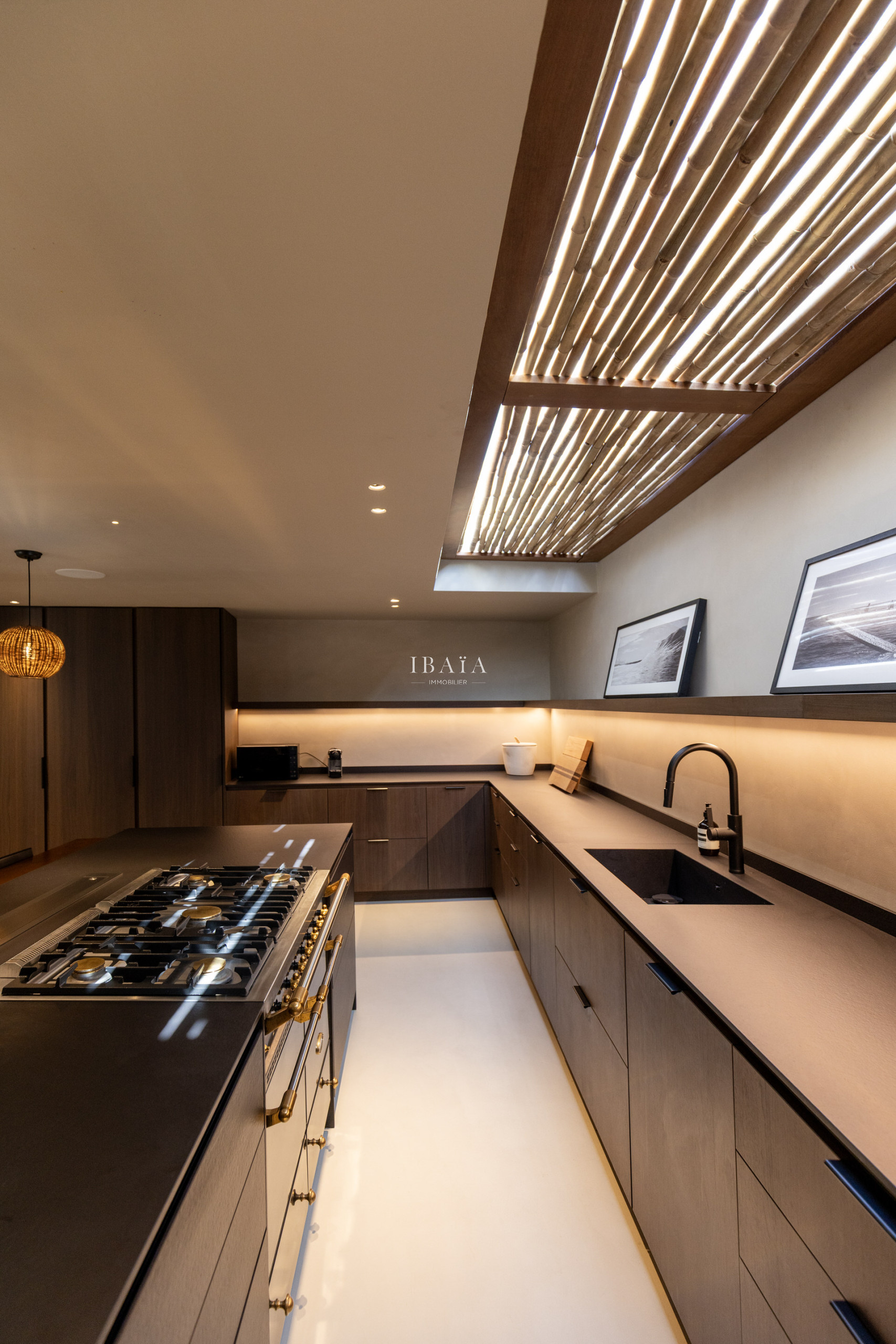 Ouverte sur le salon, réfrigérateur, congélateur, lave-vaisselle, four, four micro-ondes, cafetière filtre, cafetière expresso, grille-pain, bouilloire, presse-agrumes, cave à vin, distributeur de glaçons, TV (satellite français et américain, Apple TV).