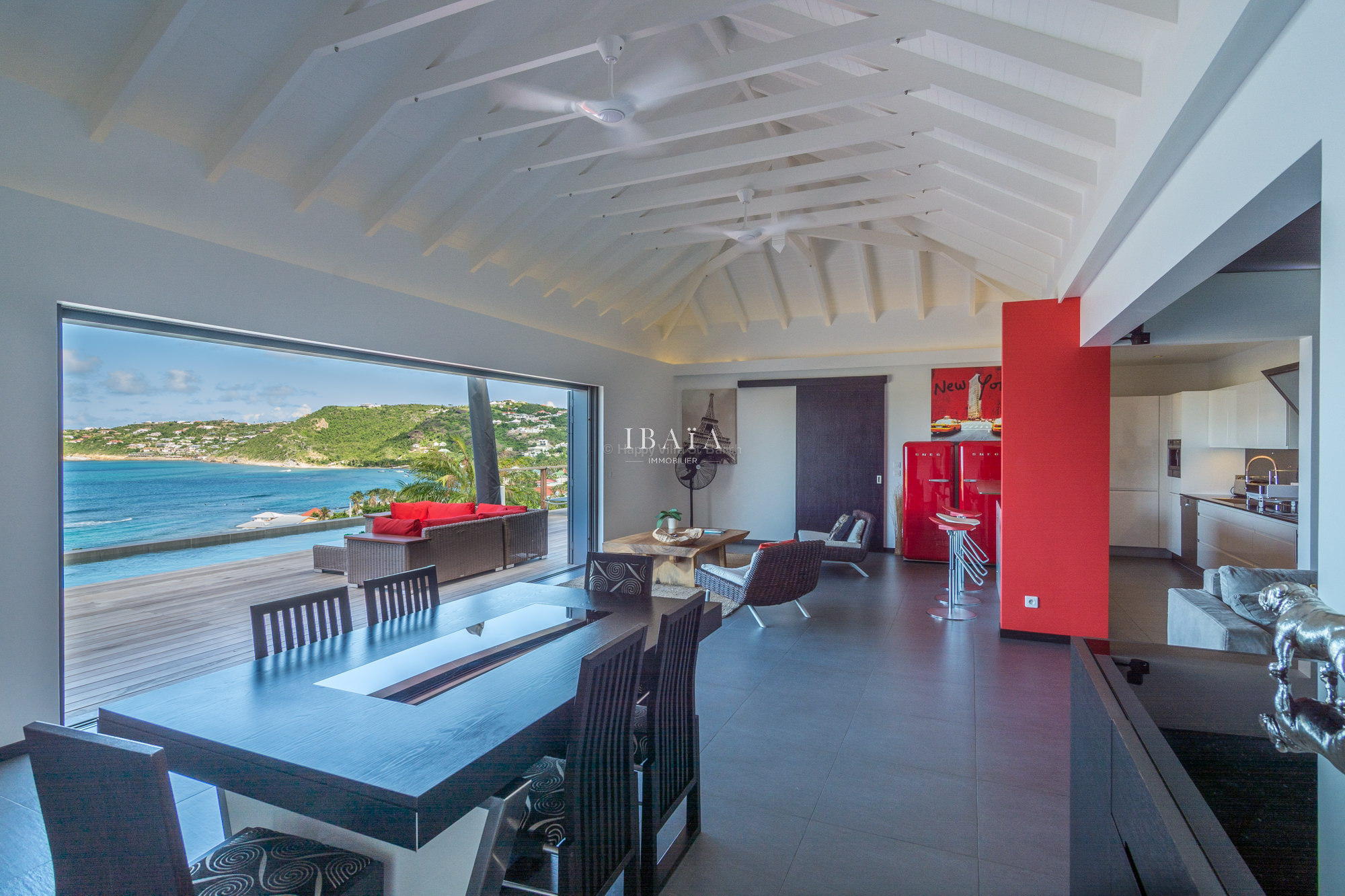 Avec une décoration colorée moderne, la villa s’articule autour de la terrasse et sa piscine chauffée. La cuisine moderne bien équipée dans des tons rouges et argentés, s’ouvre sur le séjour et le coin repas face à la vue et à la piscine.
