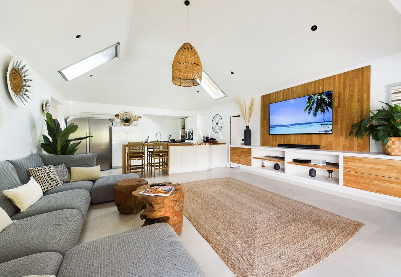 La pièce de vie, vaste et lumineuse, s’ouvre sur une cuisine moderne entièrement équipée et un salon chaleureux. Les matières naturelles, les teintes douces et les détails déco soignés créent une ambiance apaisante. La terrasse ombragée accueille une belle table à manger avec vue sur la piscine chauffée, entourée de transats et de verdure tropicale.