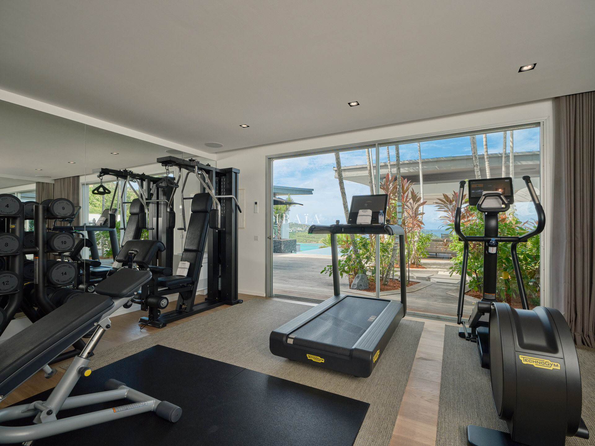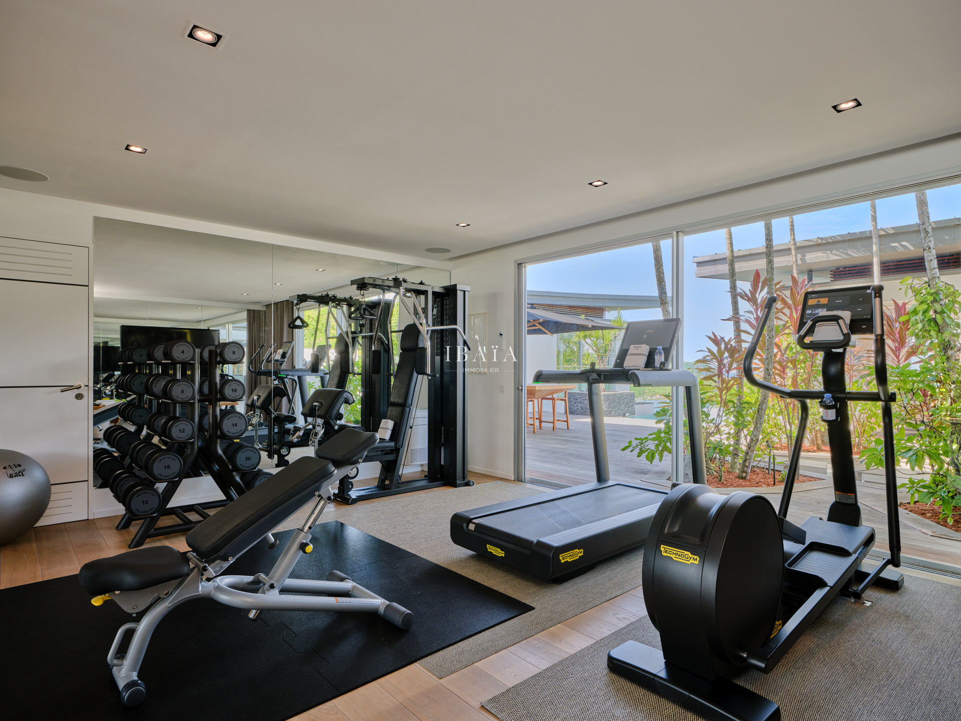 Climatisation (A/C), TV, système de sons, tapis de course, elliptique, banc de musculation ajustable, support vertical d’althères, set de 10 paires d’haltères, 1 Machine polyvalente de musculation, 1 barre de danse classique et une échelle murale en bois