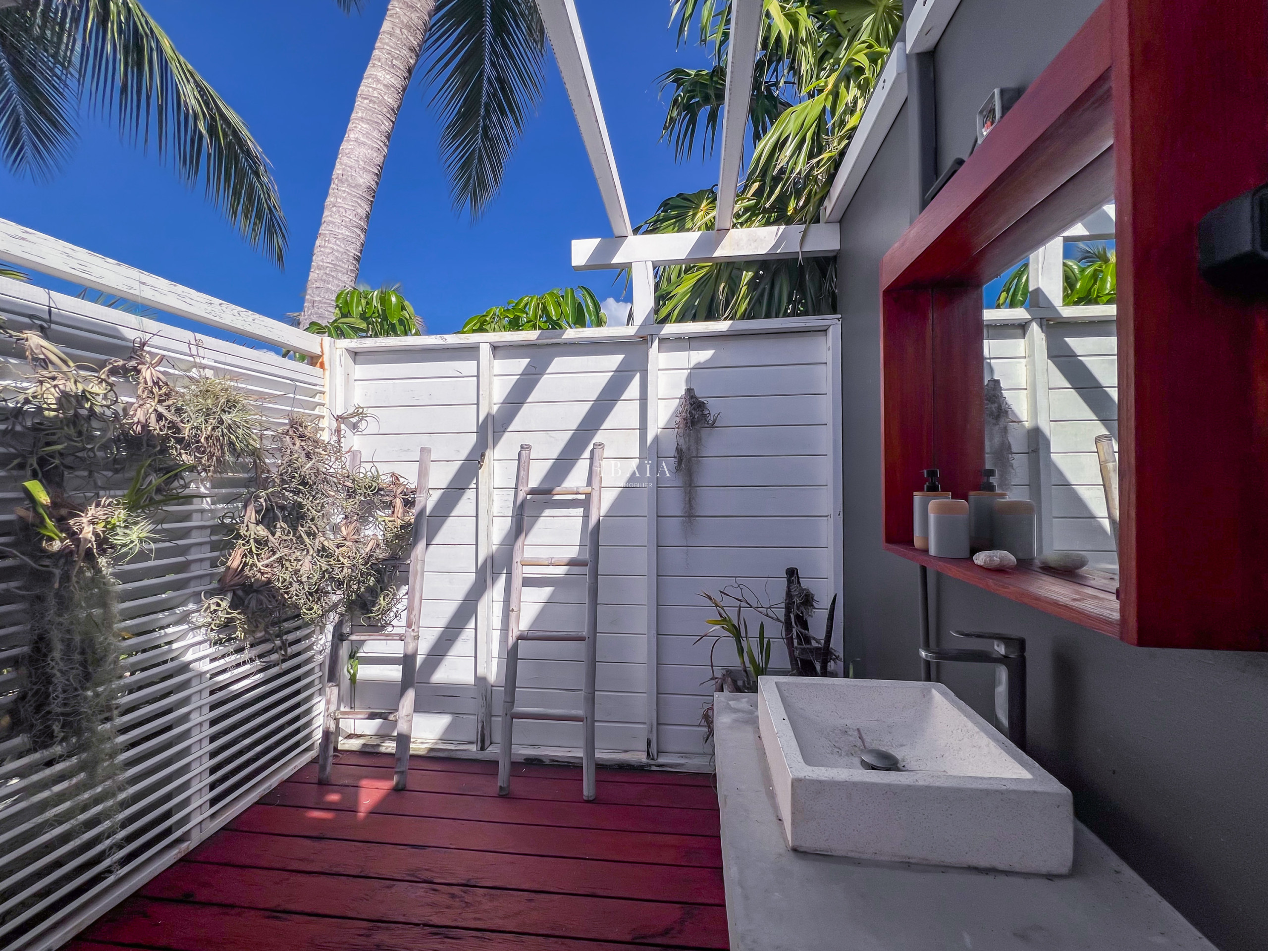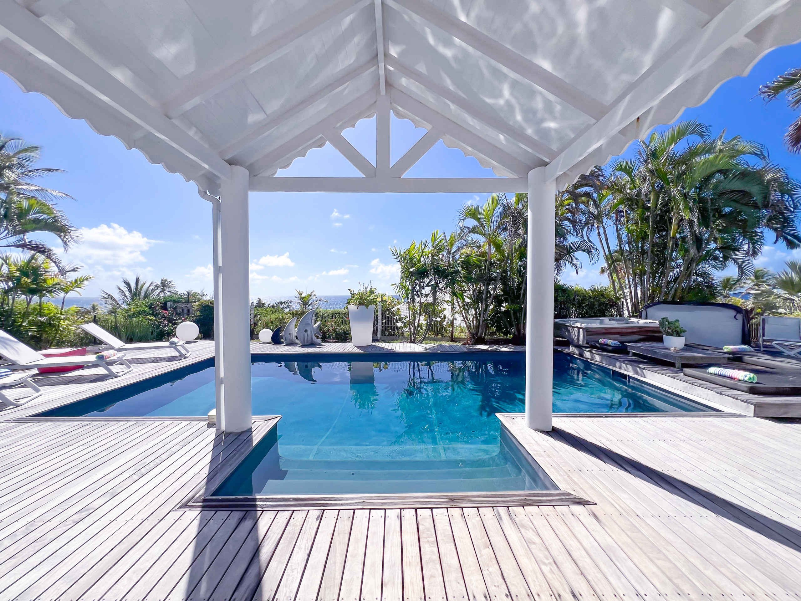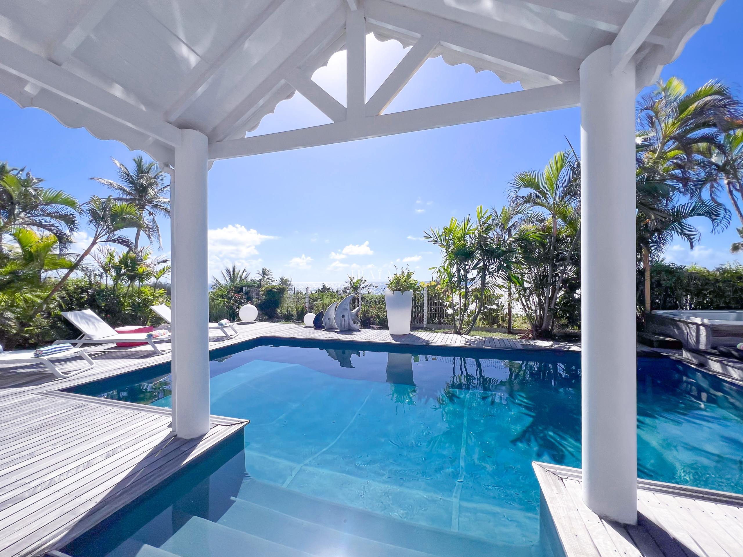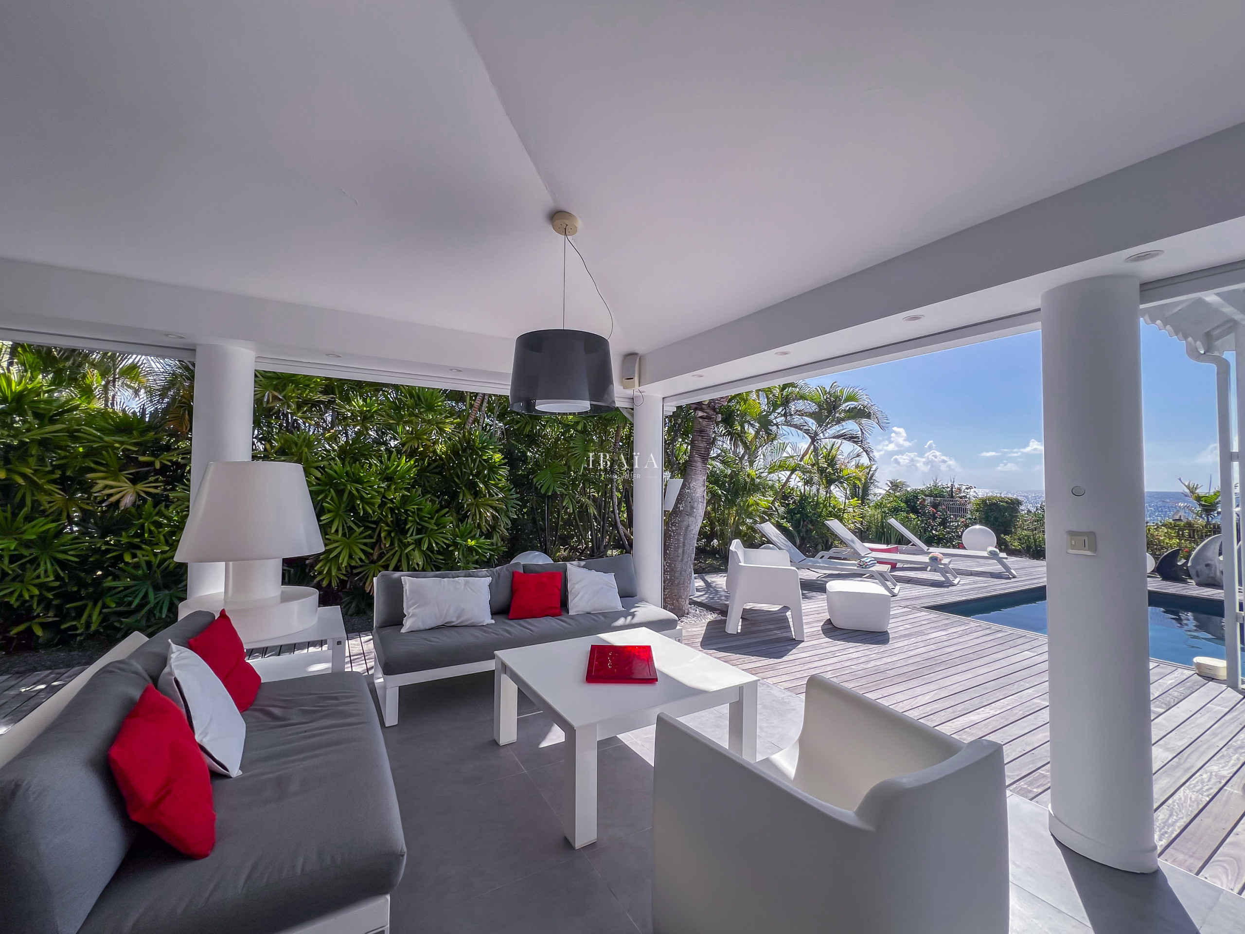 Son architecture contemporaine la rend totalement ouverte sur l'extérieur. En effet, une vaste terrasse en deck agrémentée d'une piscine privative et de ses carbets, invite à profiter pleinement du climat ensoleillé de la Guadeloupe. Offrant ainsi une ambiance idéale pour se détendre et se ressourcer.