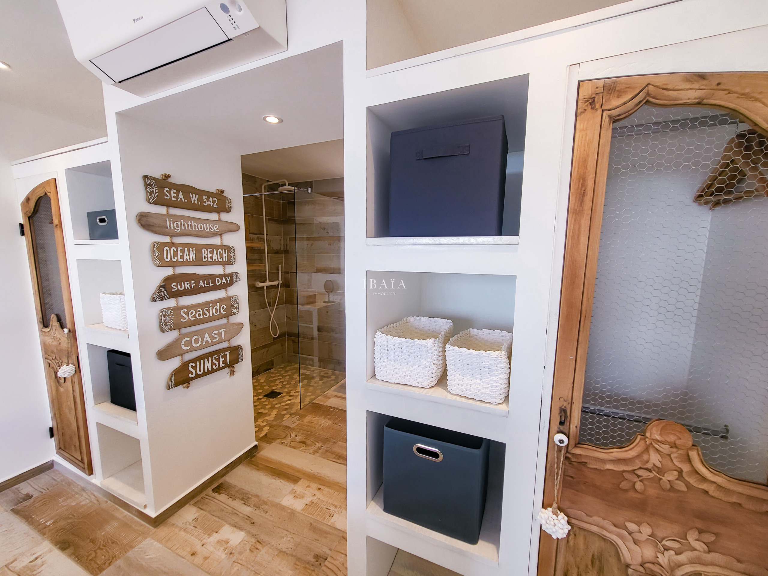 L’âme unique de la Villa Lagon réside dans sa décoration soigneusement pensée, où chaque objet raconte une histoire. Les pièces chinées et brocantées confèrent à cette demeure une atmosphère à la fois luxueuse et intime, une véritable invitation au voyage.