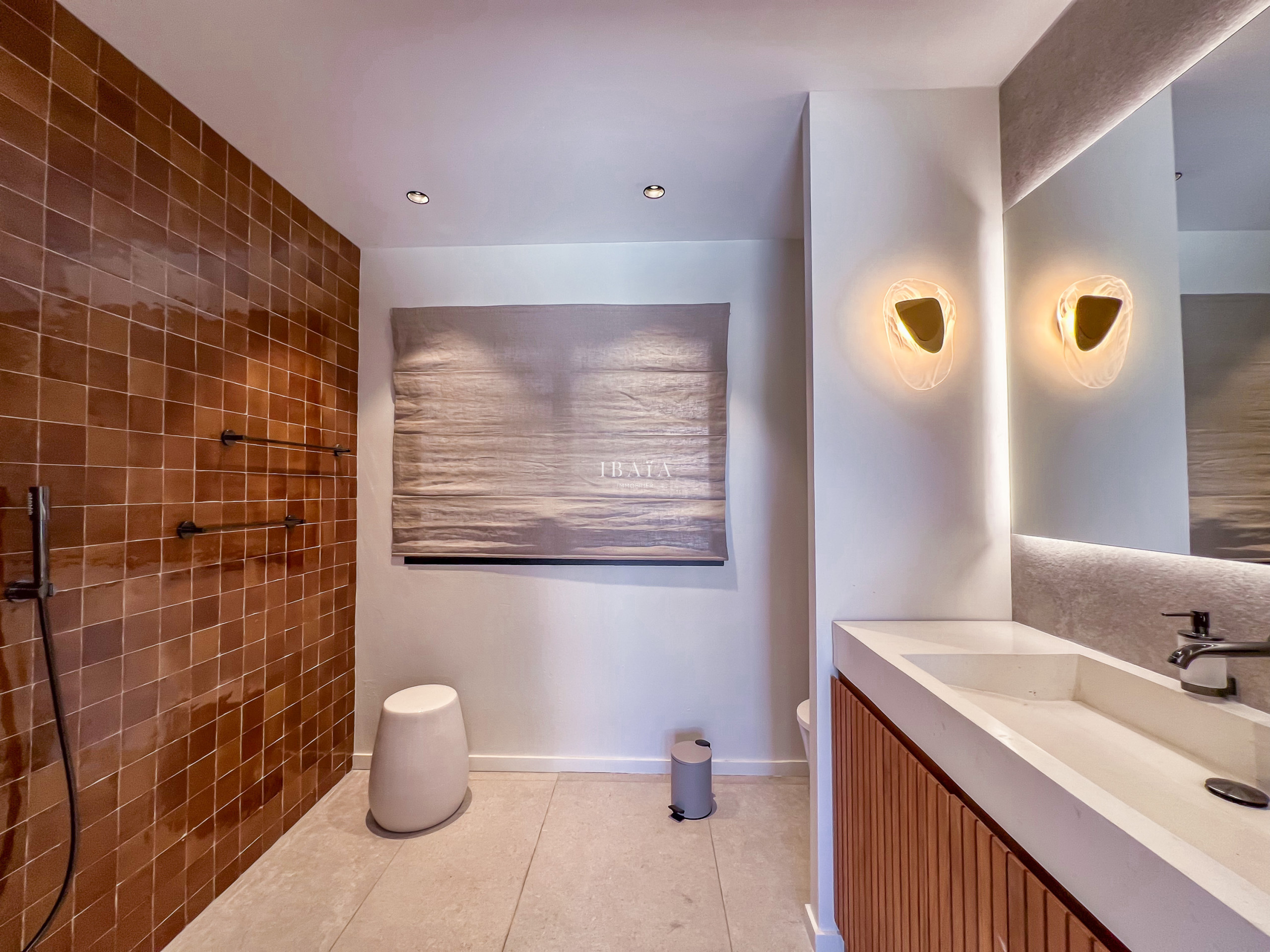La villa dispose de 4 chambres climatisées, dont 2 suites parentales avec leur propre salle de douche attenante, des rangements et un accès direct à la piscine. Deux autres chambres, l'une avec un lit double et l'autre avec deux lits simples, se partagent une salle de bain.
