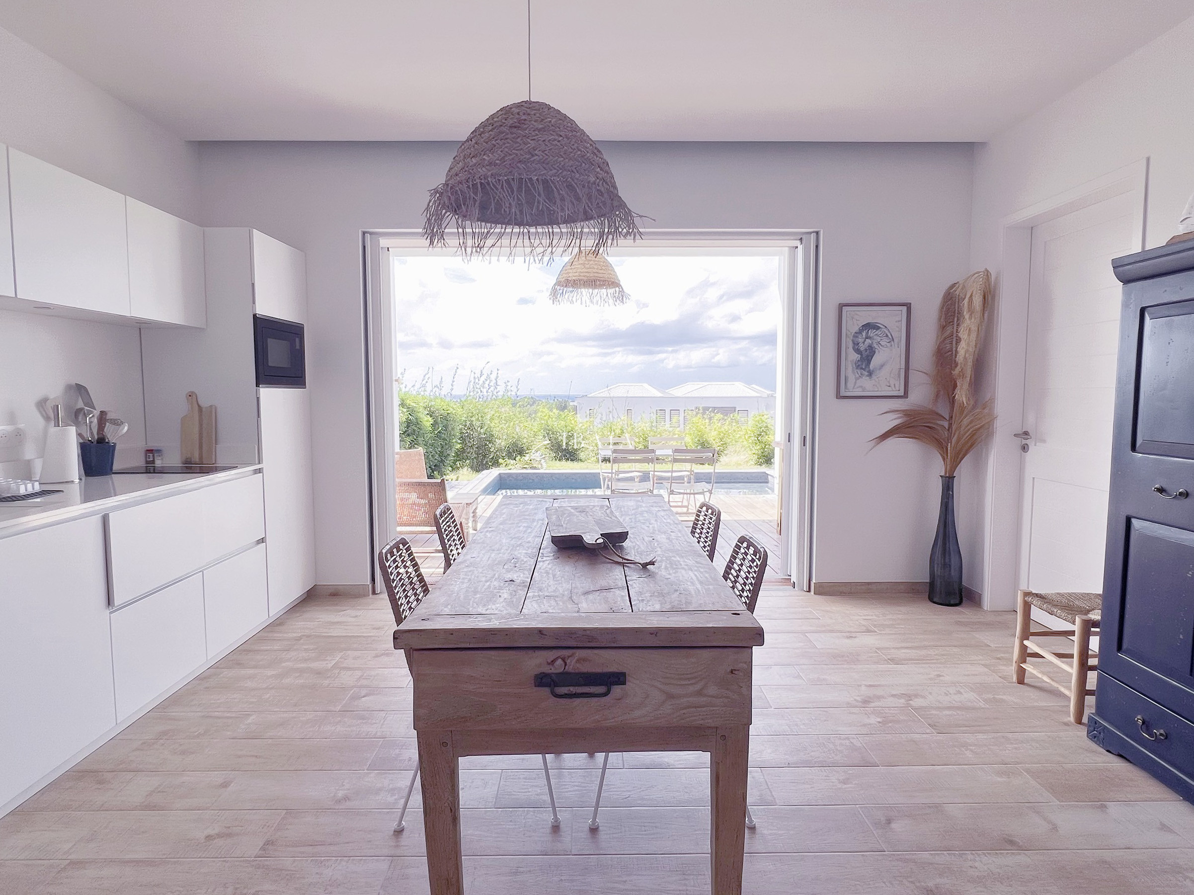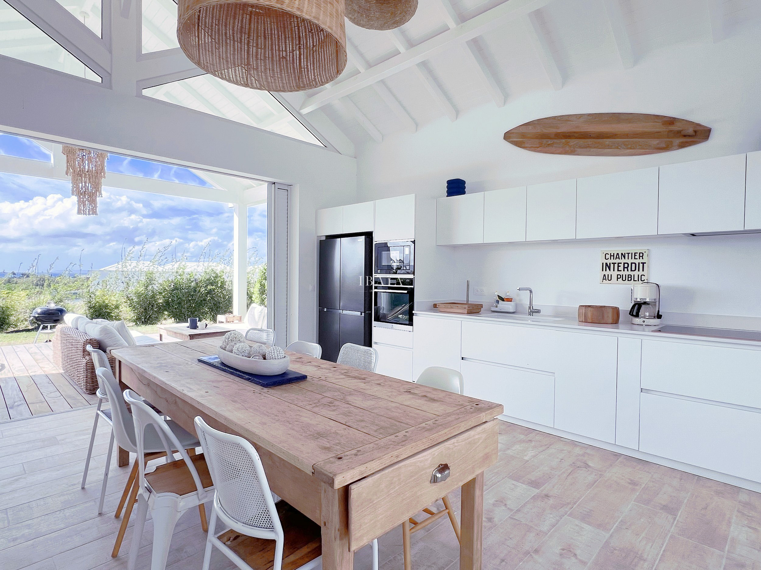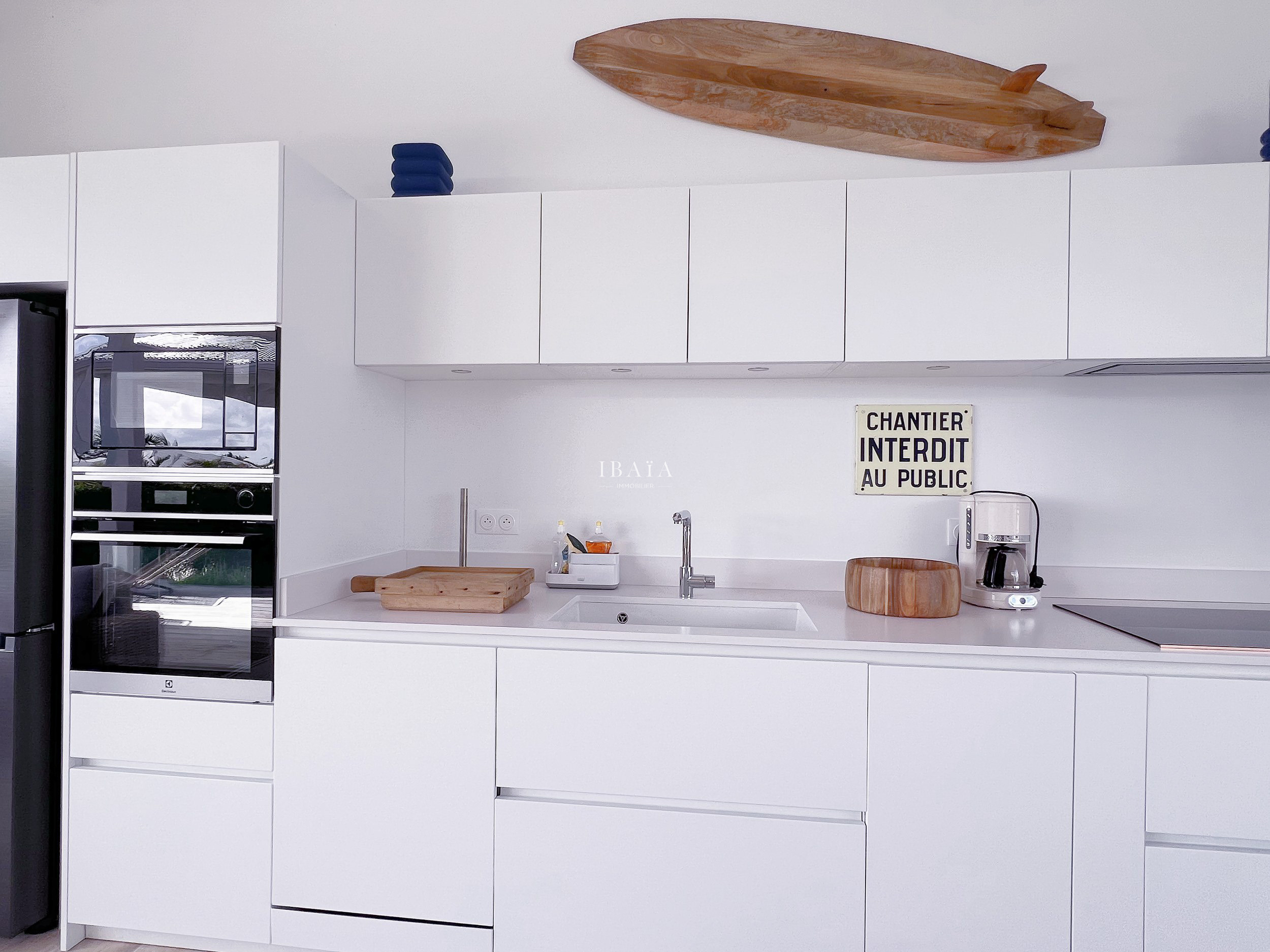 · Une cuisine américaine parfaitement équipée pour des moments gourmands derrière les fourneaux avec une délicate vue mer
