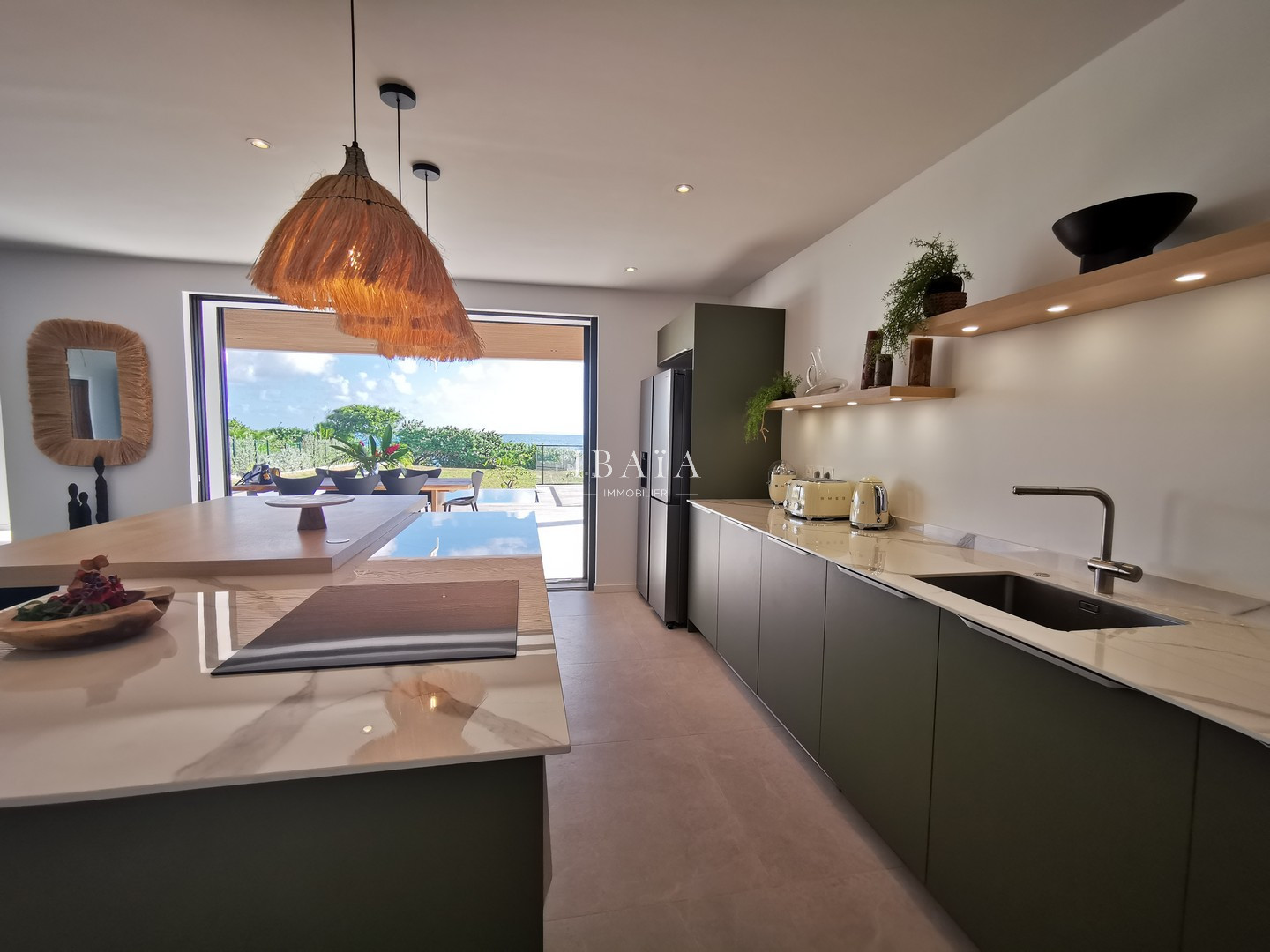 · Une cuisine américaine moderne parfaitement équipée avec îlot central, l'endroit parfait pour des moments gourmands tout en profitant d'un agréable panorama marin